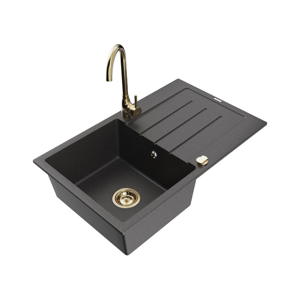 Mexen Bruno, 1-komorový granitový dřez s odkapávačem 795x495x200 mm a zlatá kuchyňská baterie Telma, černá skvrnitá, 6513-76-670200-50