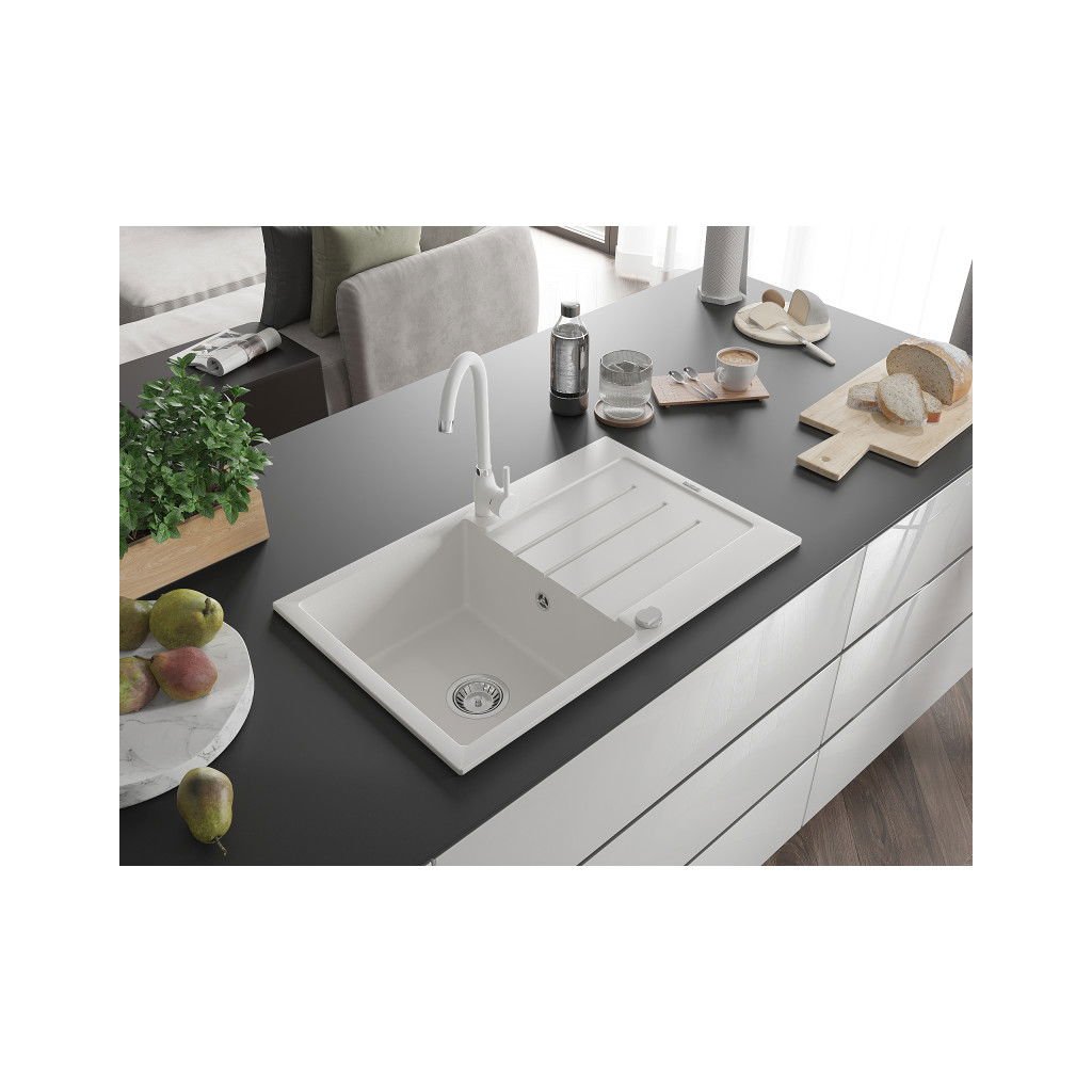 Mexen Bruno, 1-komorový granitový dřez s odkapávačem 80x50 cm a kuchyňskou baterií Telma, bílá, 6513-20-670200-20