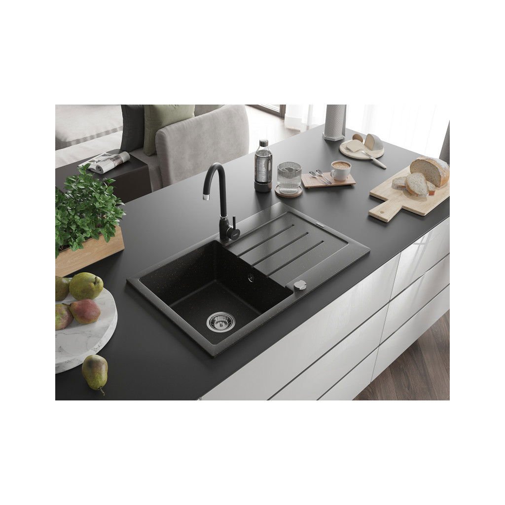 Mexen Bruno, 1-komorový granitový dřez s odkapávačem 80x50 cm a kuchyňskou baterií Telma, černá-zlatá, 6513-75-670200-70