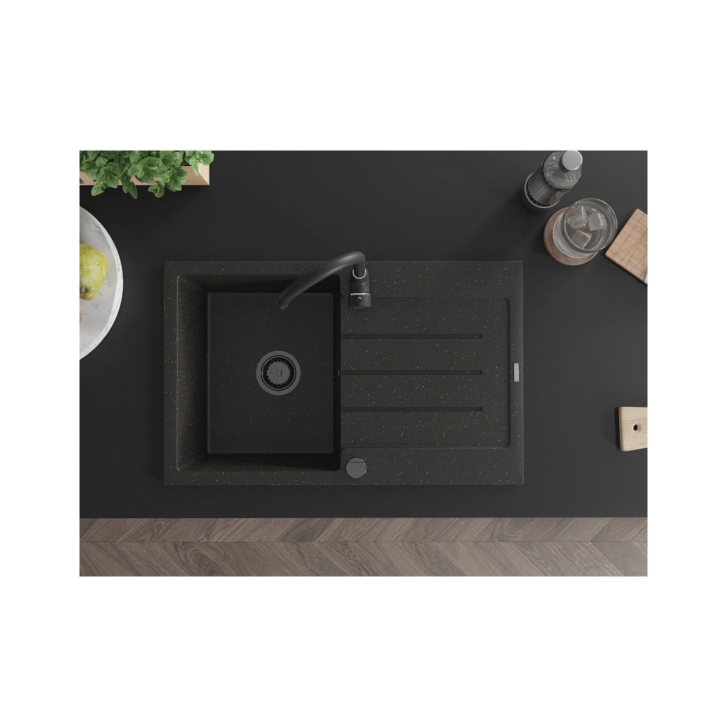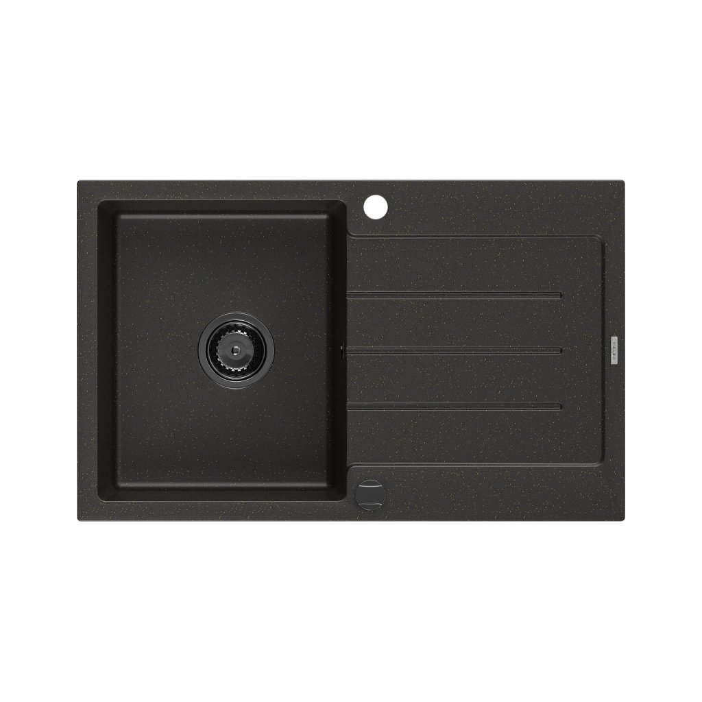 Mexen Bruno, granitový dřez 795x495x200 mm, 1-komorový, černá se zlatou metalízou a černým sifonem, 6513791010-75-B