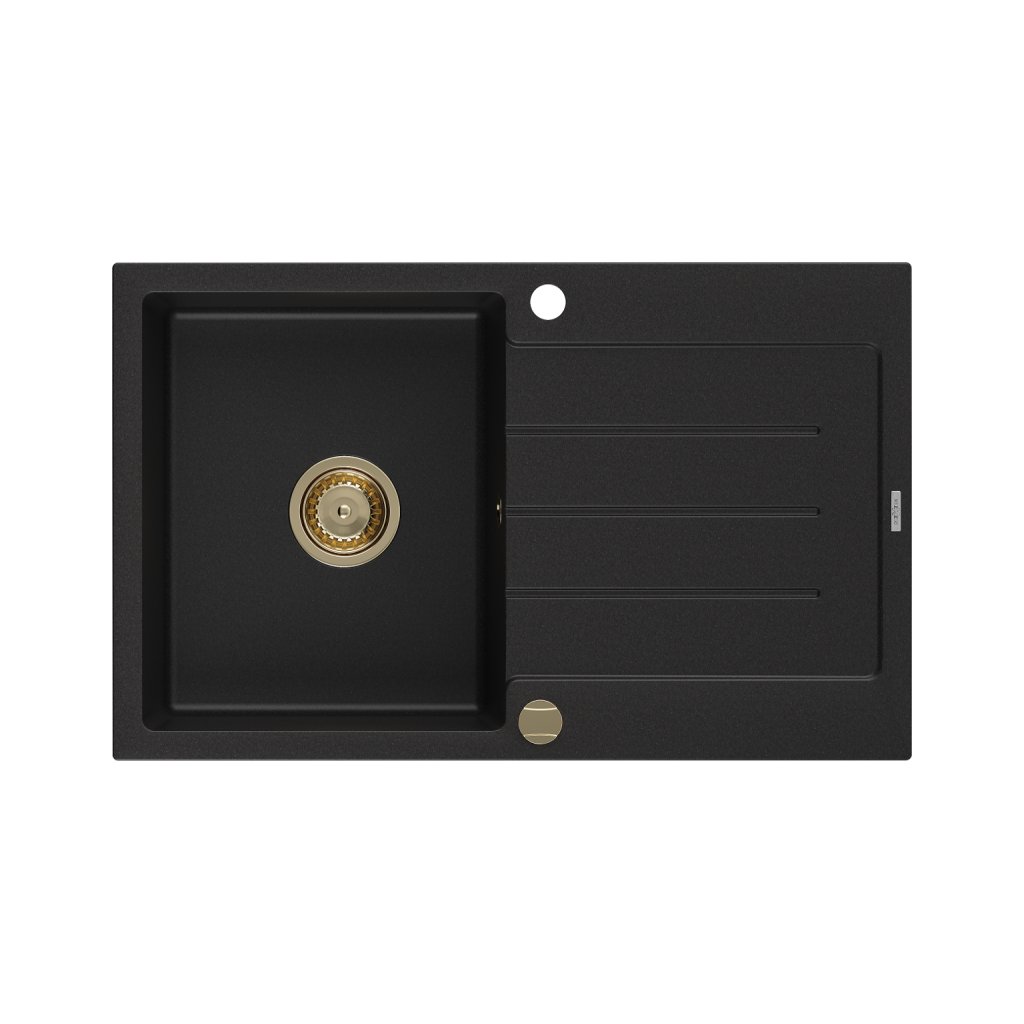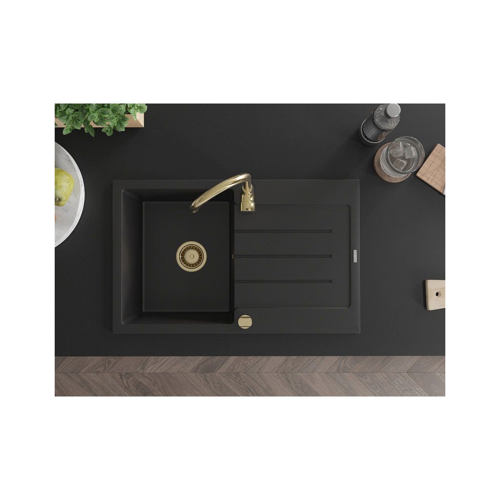 Mexen Bruno, granitový dřez 795x495x200 mm, 1-komorový, černá se zlatým sifonem, 6513791010-77-G