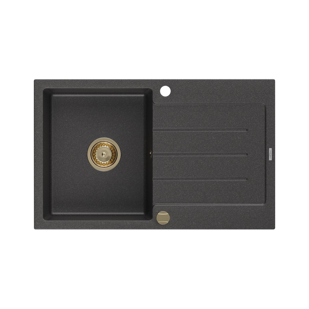 Mexen Bruno, granitový dřez 795x495x200 mm, 1-komorový, černá skvrnitá se zlatým sifonem, 6513791010-76-G
