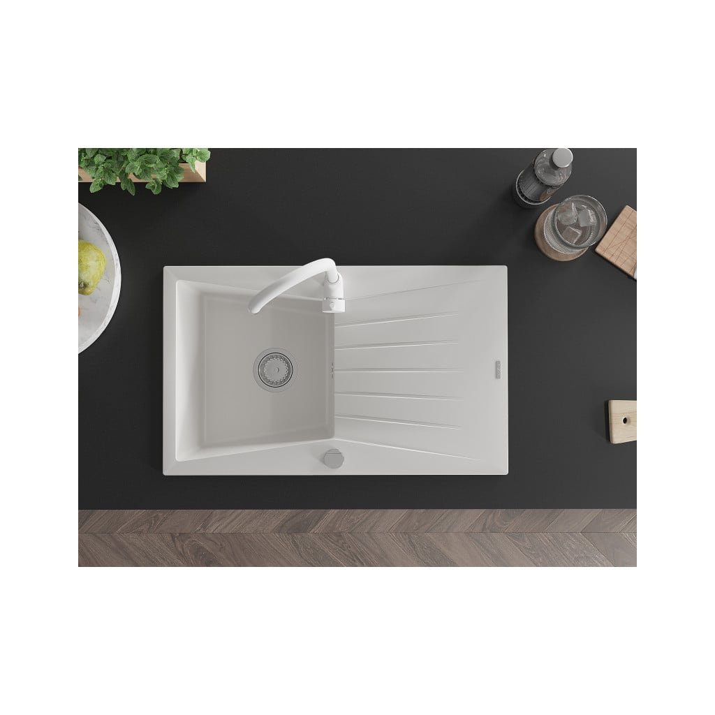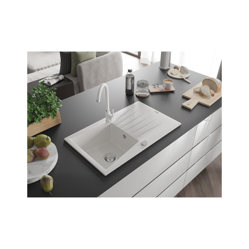 Mexen Cesar, 1-komorový granitový dřez s odkapávačem 78x47 cm a kuchyňskou baterií Telma, bílá, 6514-20-670200-20