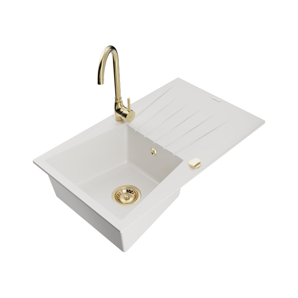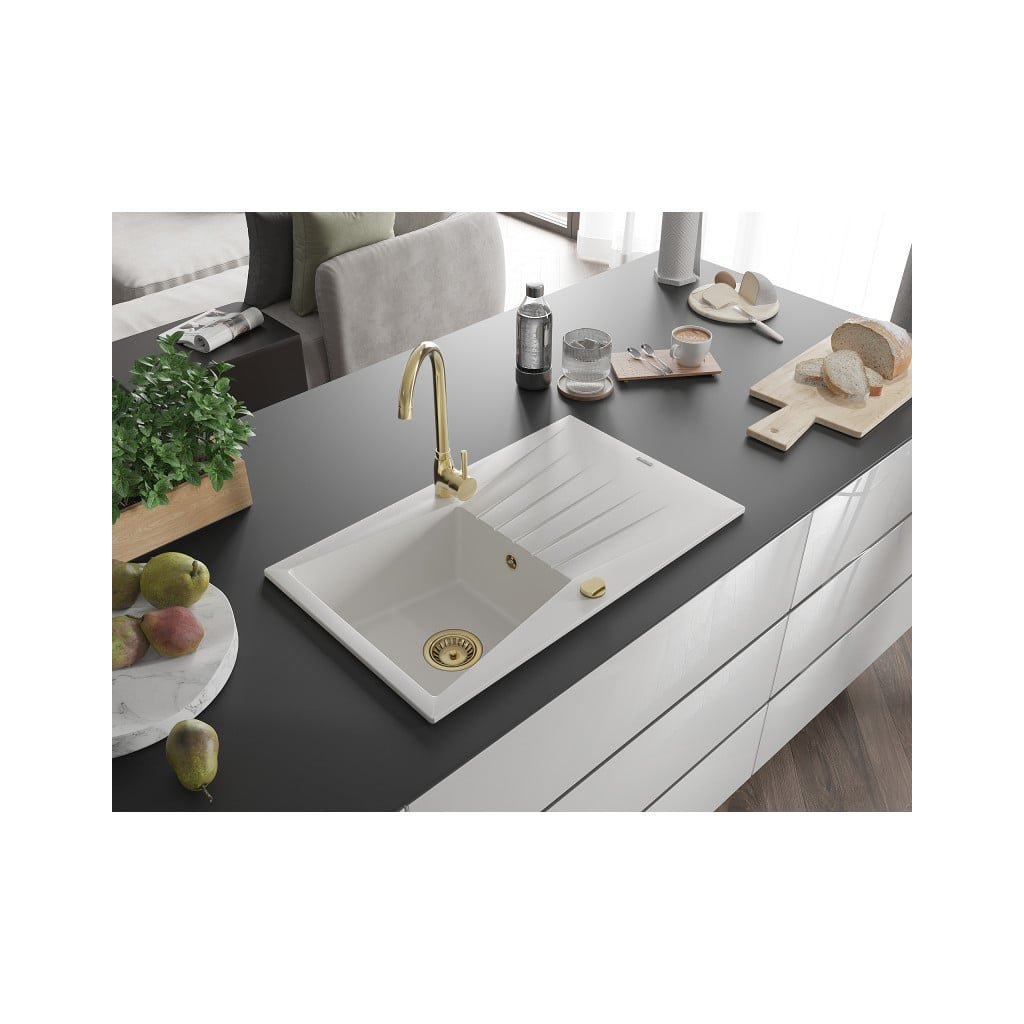 Mexen Cesar, 1-komorový granitový dřez s odkapávačem 78x47 cm a kuchyňskou baterií Telma, bílá, 6514-20-670200-50