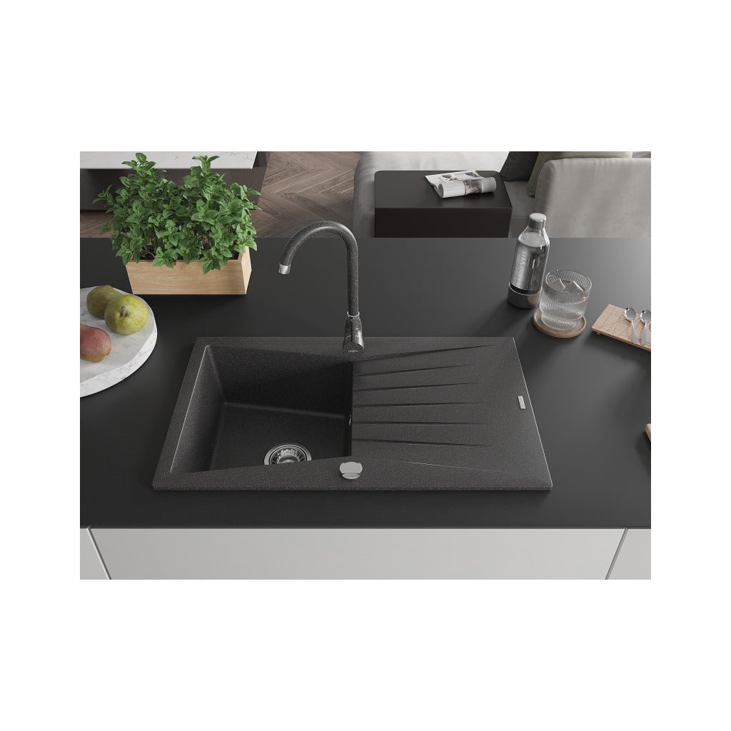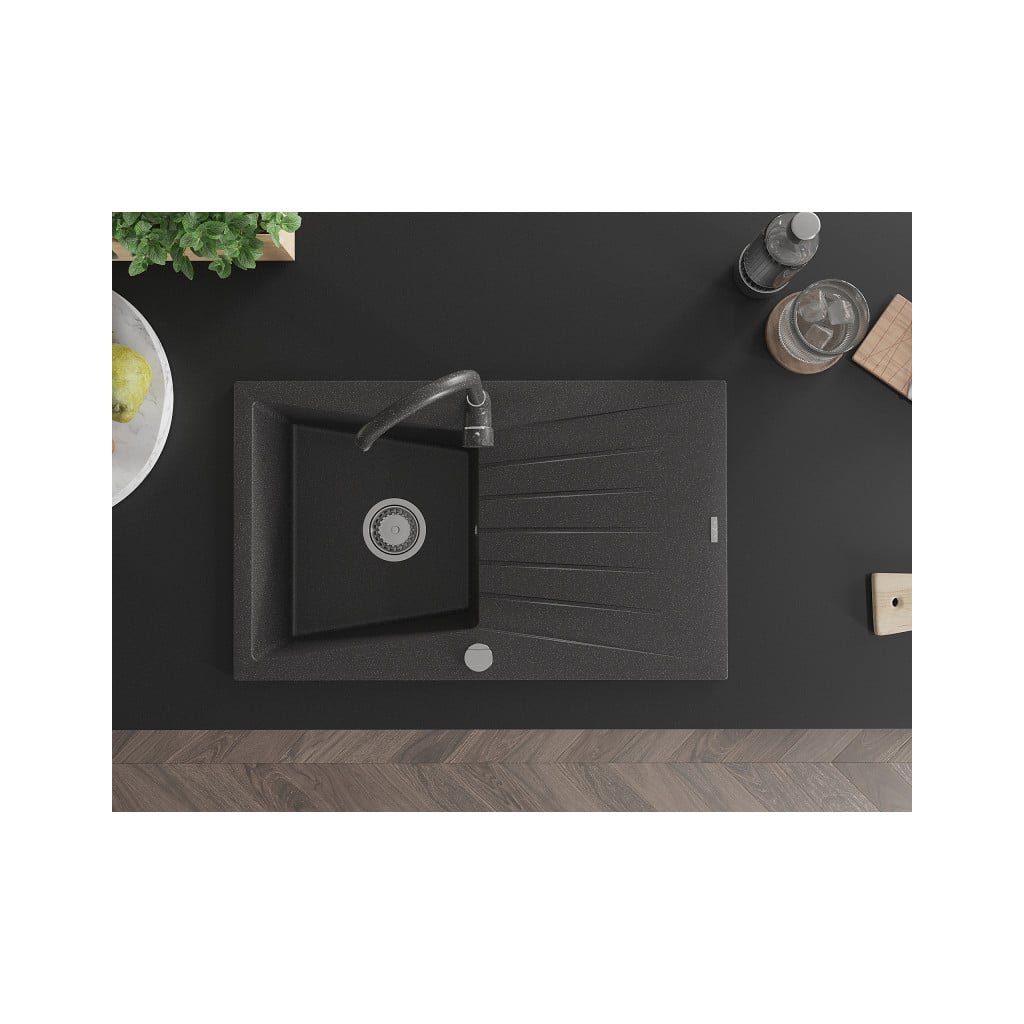 Mexen Cesar, 1-komorový granitový dřez s odkapávačem 78x47 cm a kuchyňskou baterií Telma, černá-skvrnitá, 6514-76-670200-76