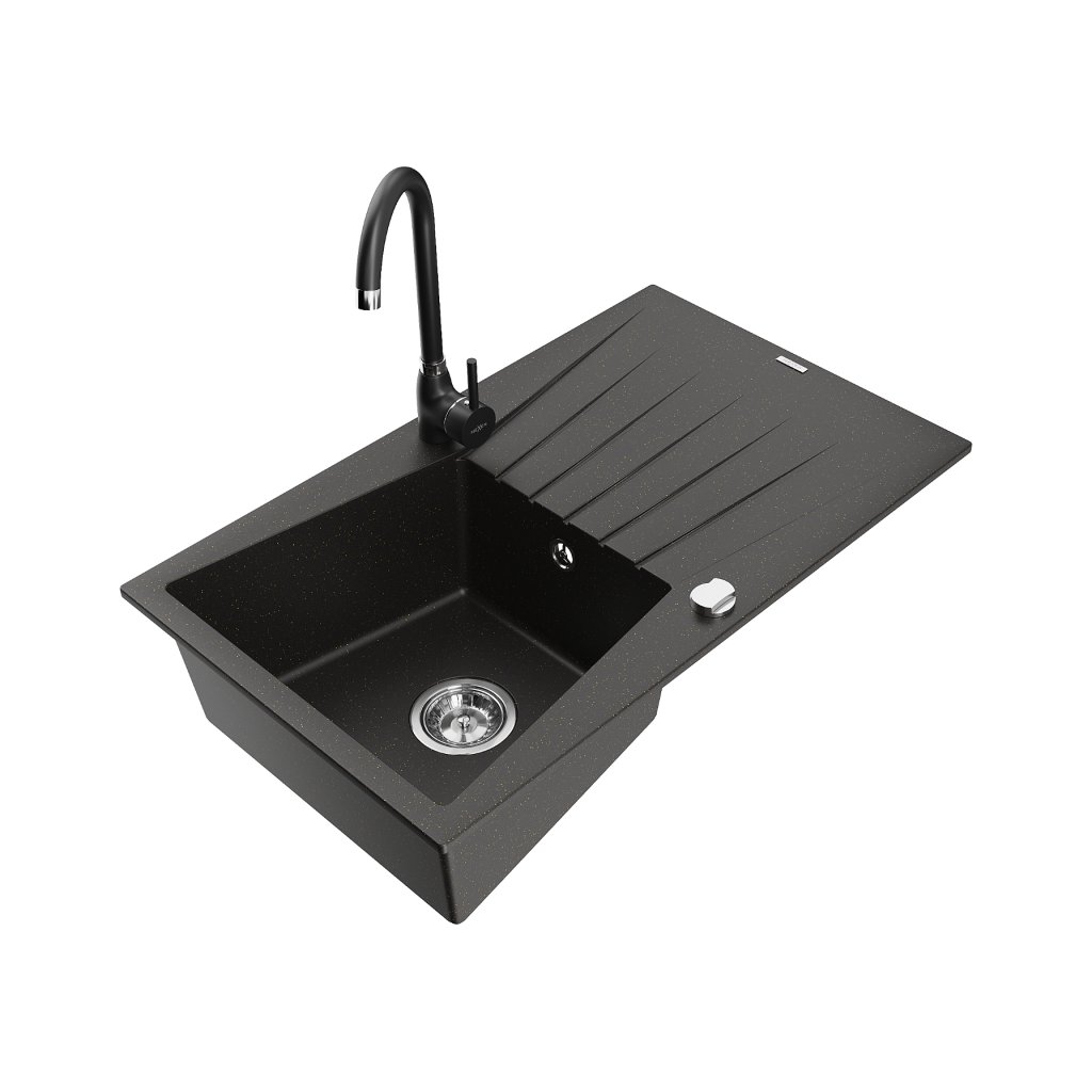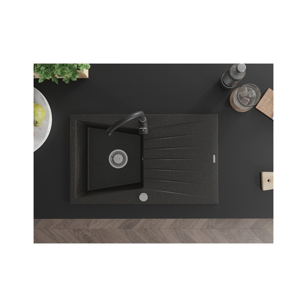 Mexen Cesar, 1-komorový granitový dřez s odkapávačem 78x47 cm a kuchyňskou baterií Telma, černá-zlatá, 6514-75-670200-70
