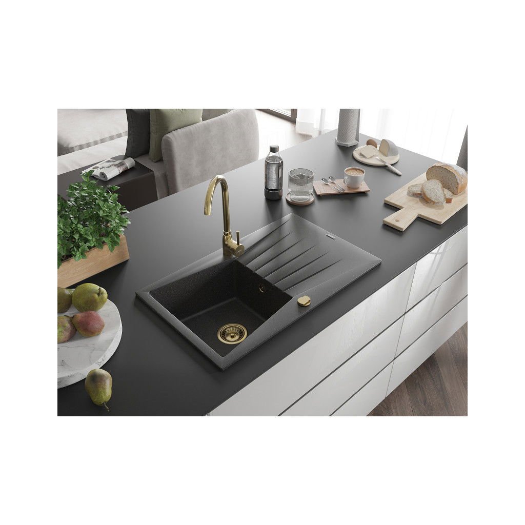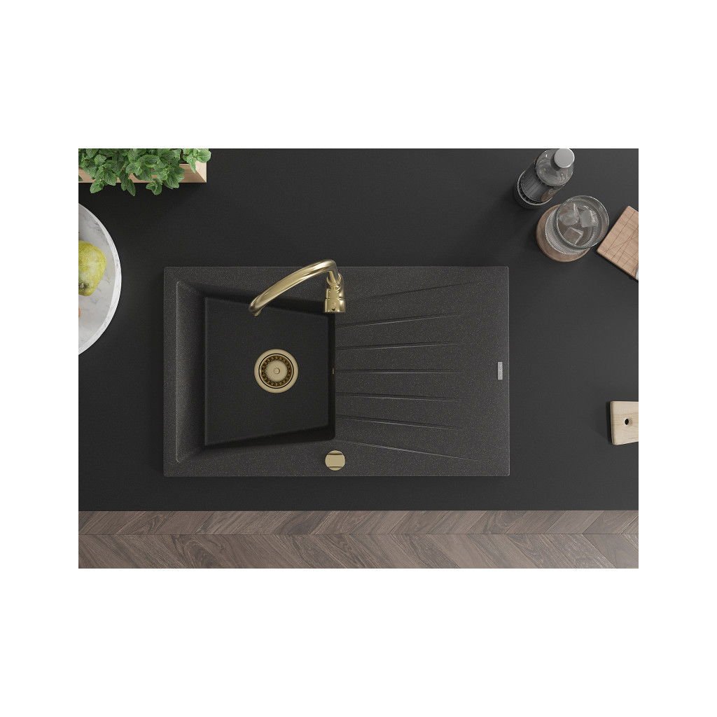 Mexen Cesar, granitový dřez 775x470x190 mm, 1-komorový, černá skvrnitá se zlatým sifonem, 6514771010-76-G