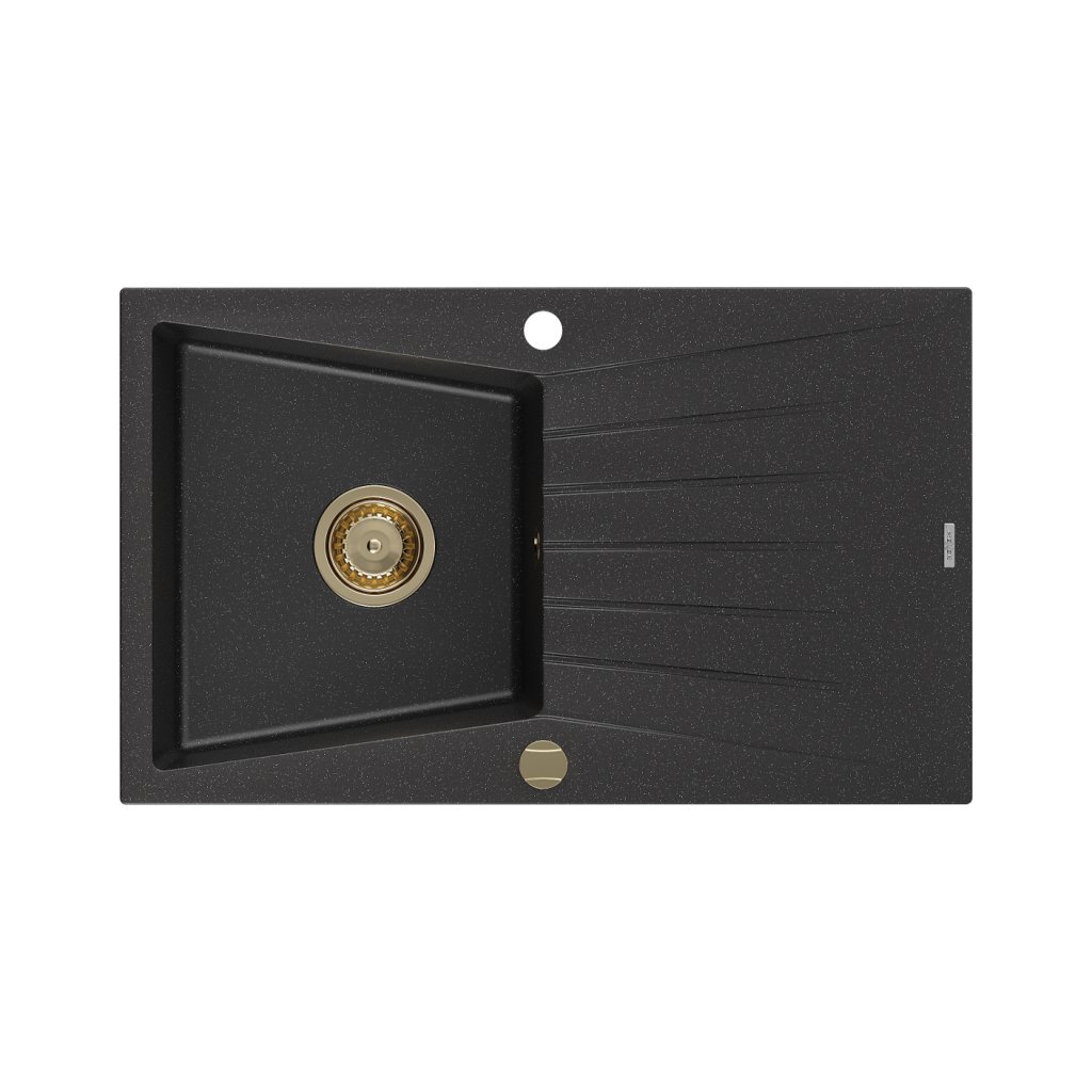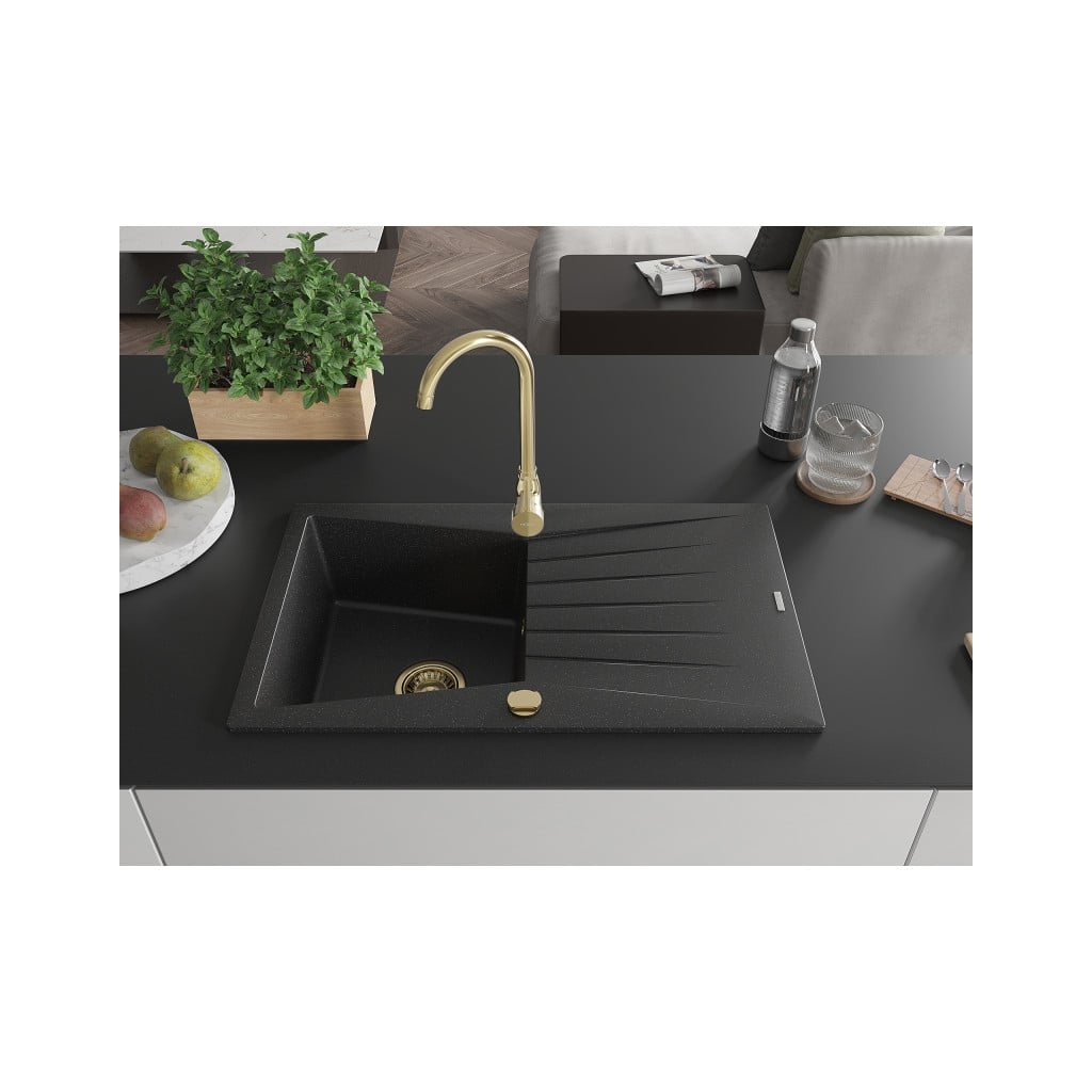 Mexen Cesar, granitový dřez 775x470x190 mm, 1-komorový, černá-stříbrná metalíza se zlatým sifonem, 6514771010-73-G