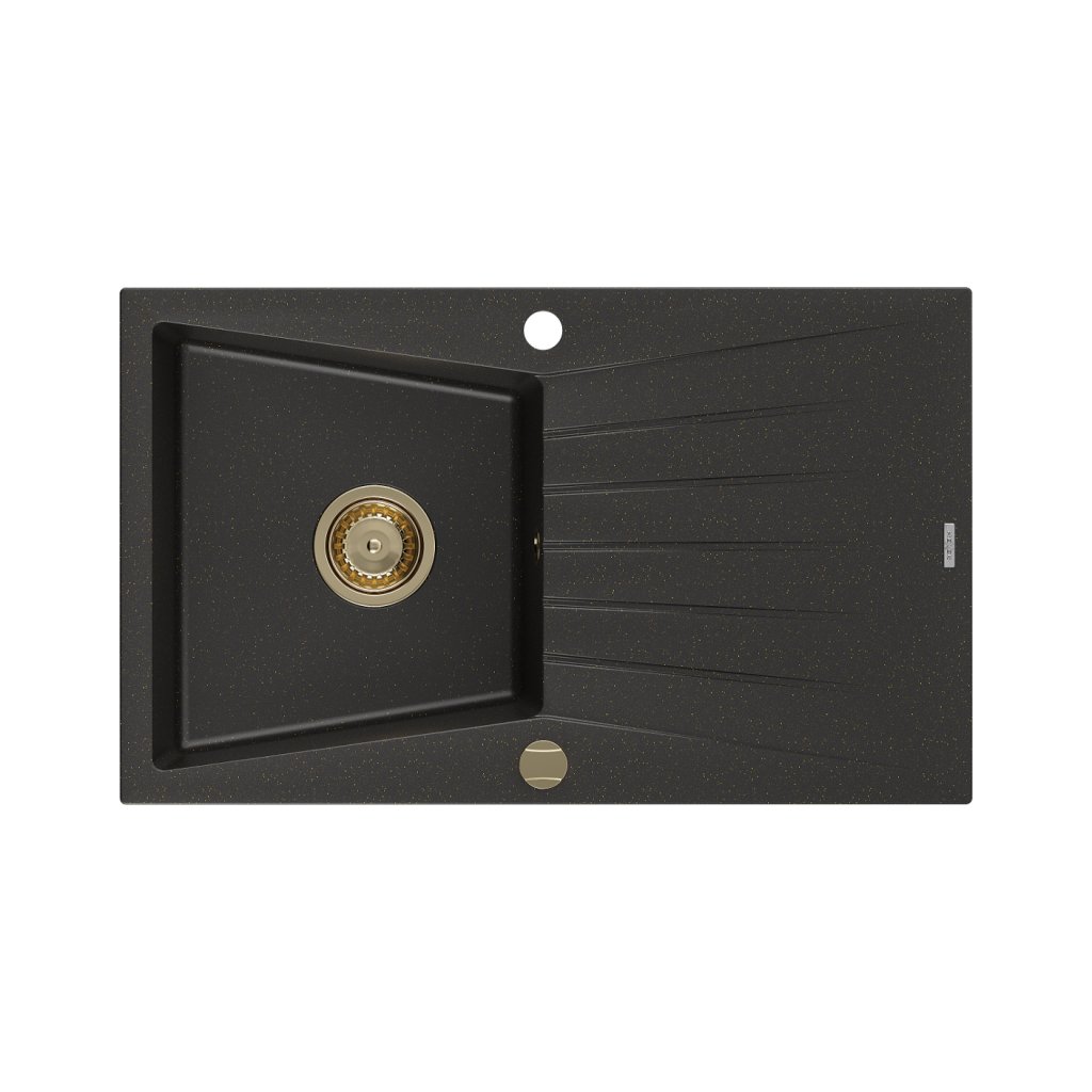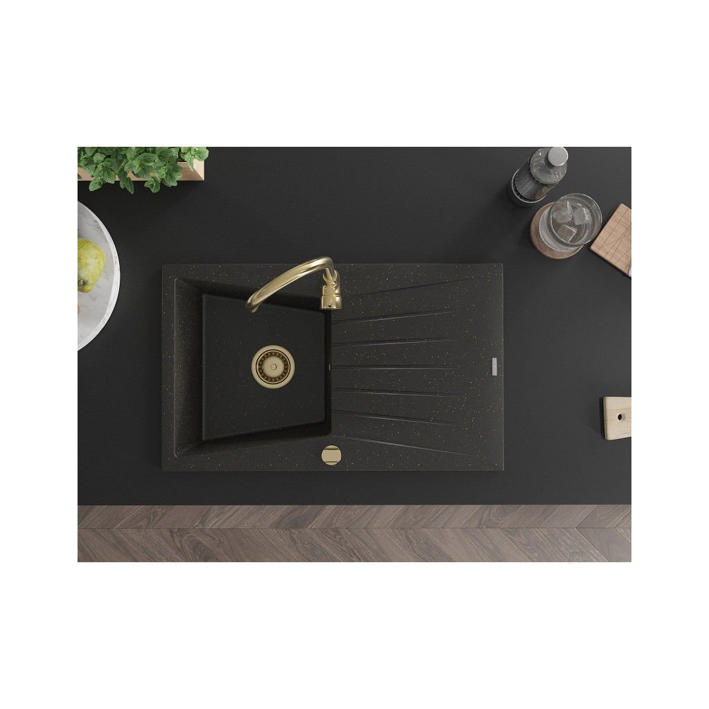 Mexen Cesar, granitový dřez 775x470x190 mm, 1-komorový, černá-zlatá metalíza se zlatým sifonem, 6514771010-75-G