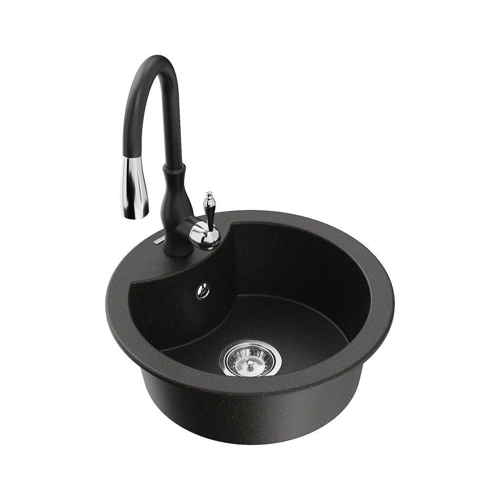 Mexen Diego, 1-komorový granitový dřez 488x488x167 mm a dřezová baterie Savita, černá-zlatá metalíza, 6512-75-672601-70