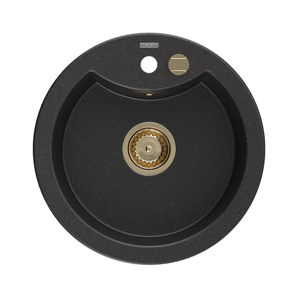 Mexen Diego, granitový dřez 488x488x167 mm, 1-komorový, černá-stříbrná metalíza se zlatým sifonem, 6512481000-73-G