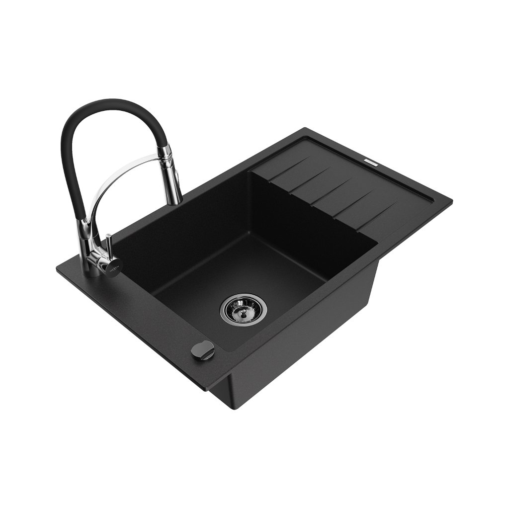 Mexen Elias, 1-komorový granitový dřez 795x480x200 mm a dřezová baterie Aster, černá, 6511-77-73450-07-B