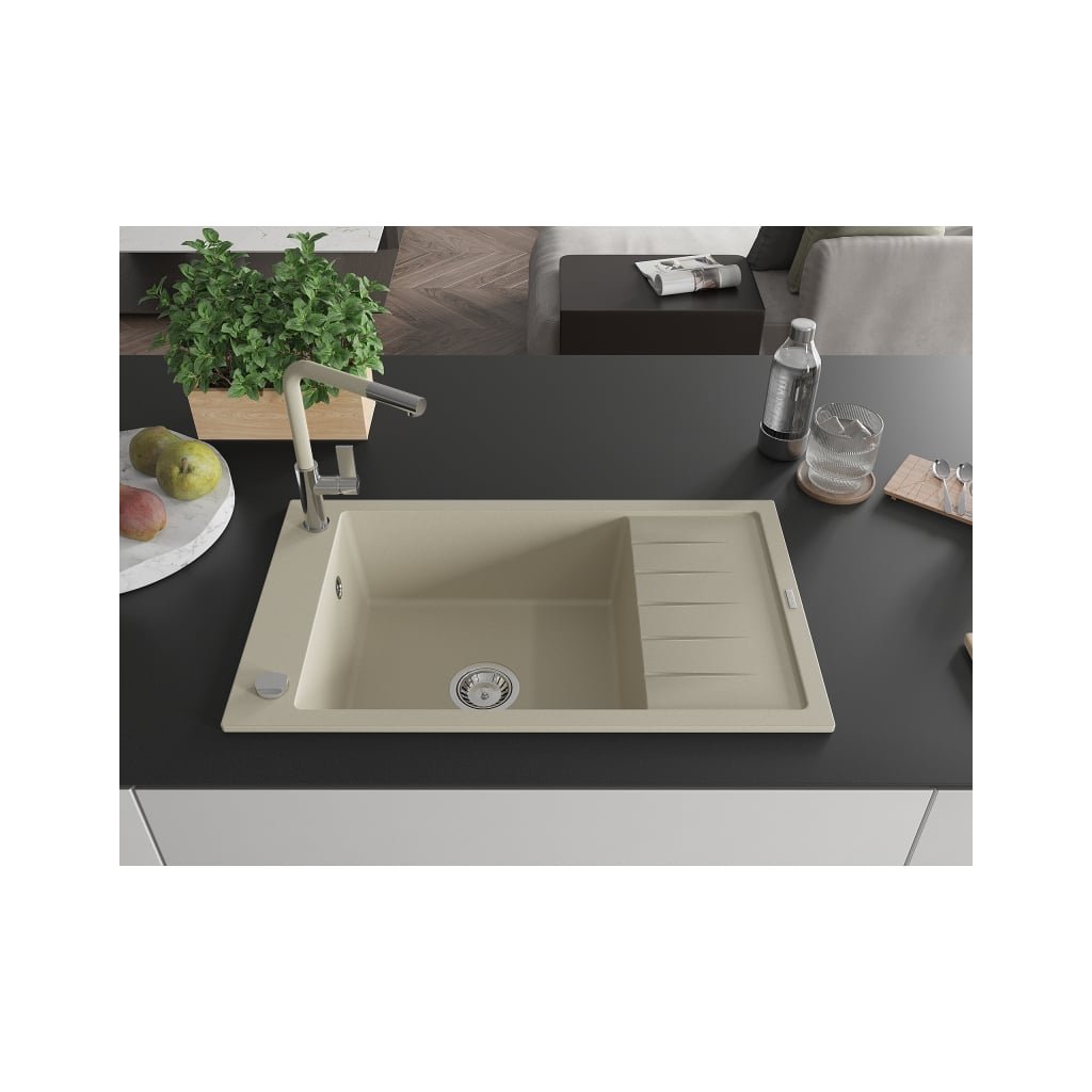 Mexen Elias, 1-komorový granitový dřez 795x480x200 mm a dřezová baterie Flora, béžová, 6511-69-670401-09