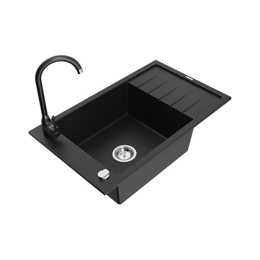 Mexen Elias, 1-komorový granitový dřez s odkapávačem 80x48 cm a kuchyňskou baterií Telma, černá, 6511-77-670200-70