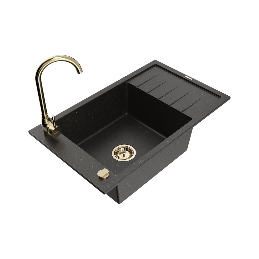 Mexen Elias, 1-komorový granitový dřez s odkapávačem 80x48 cm a kuchyňskou baterií Telma, černá-zlatá, 6511-75-670200-50