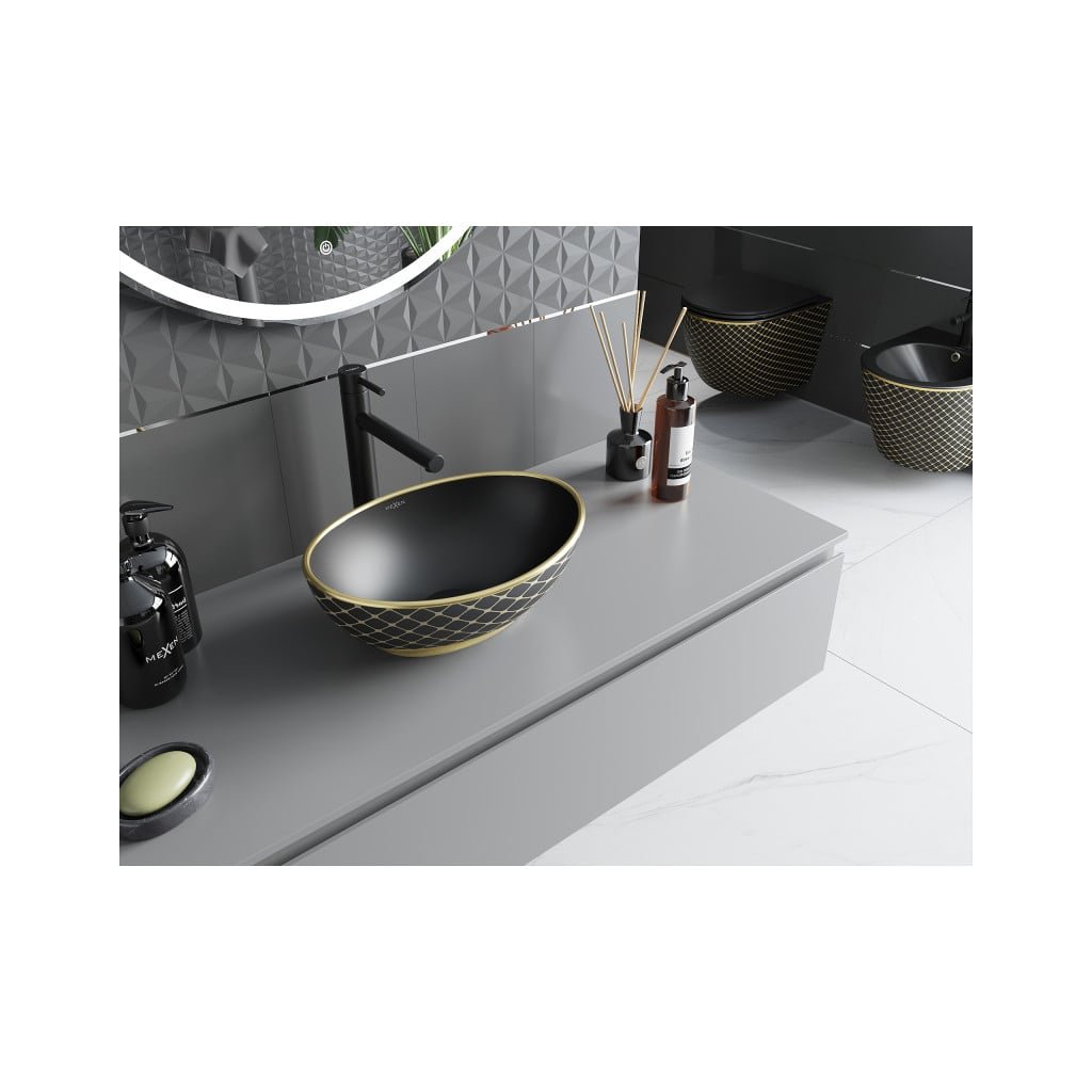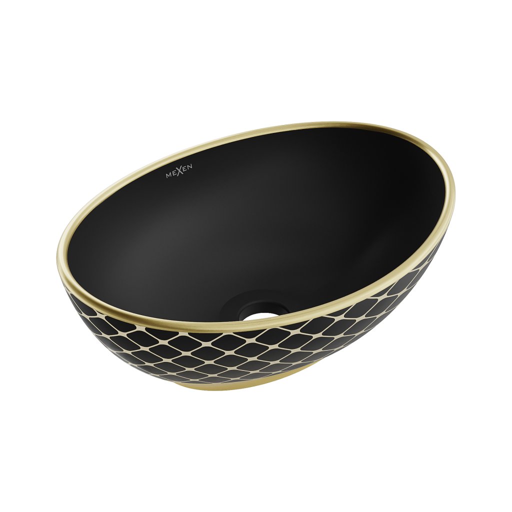 Mexen Elza, keramické umyvadlo na desku 405 x 330 mm, černá matná-zlatý vzor, 21014029