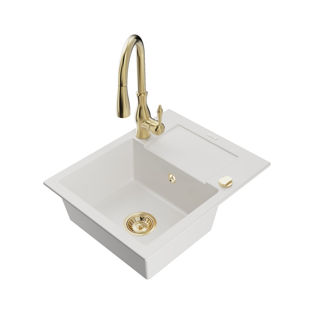 Mexen Enzo, 1-komorový granitový dřez 576x465x174 mm a dřezová baterie Savita, bílá, 6506-20-672601-50