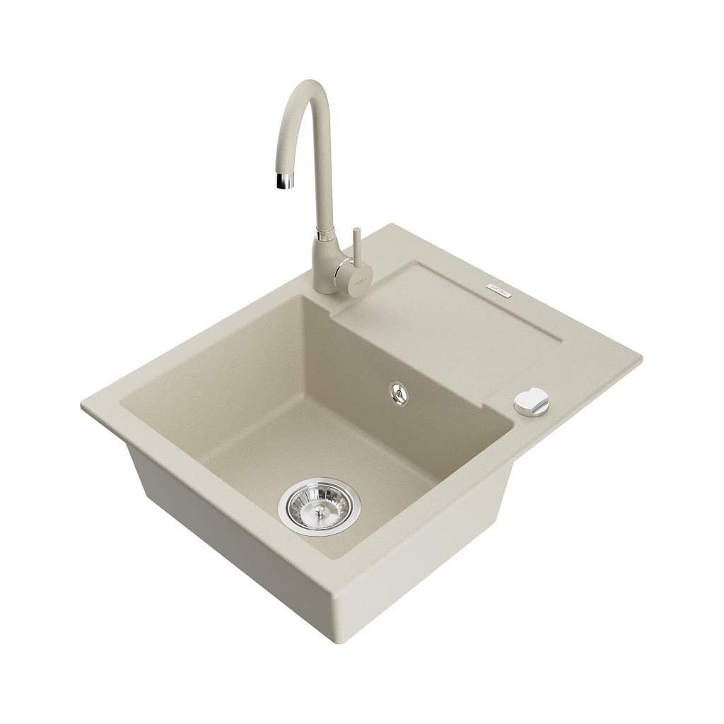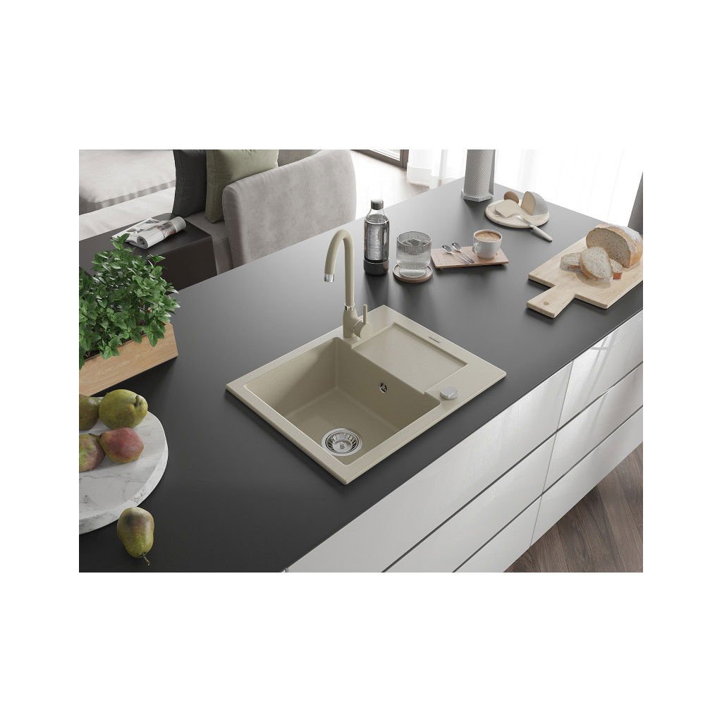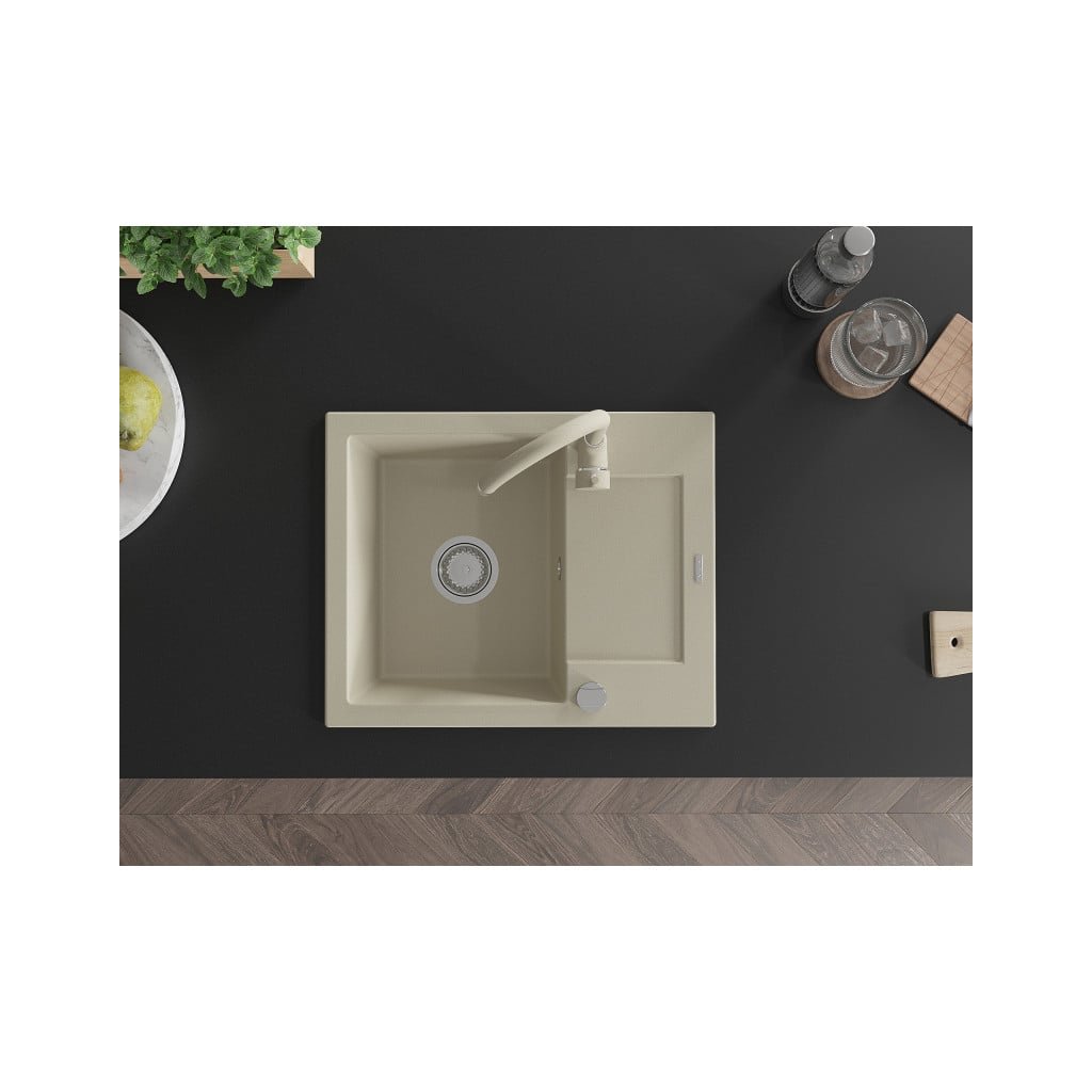 Mexen Enzo, 1-komorový granitový dřez s odkapávačem 58x47 cm a kuchyňskou baterií Telma, béžová, 6506-69-670200-69