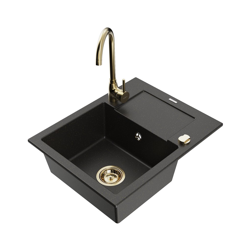 Mexen Enzo, 1-komorový granitový dřez s odkapávačem 58x47 cm a kuchyňskou baterií Telma, černá-zlatá, 6506-75-670200-50