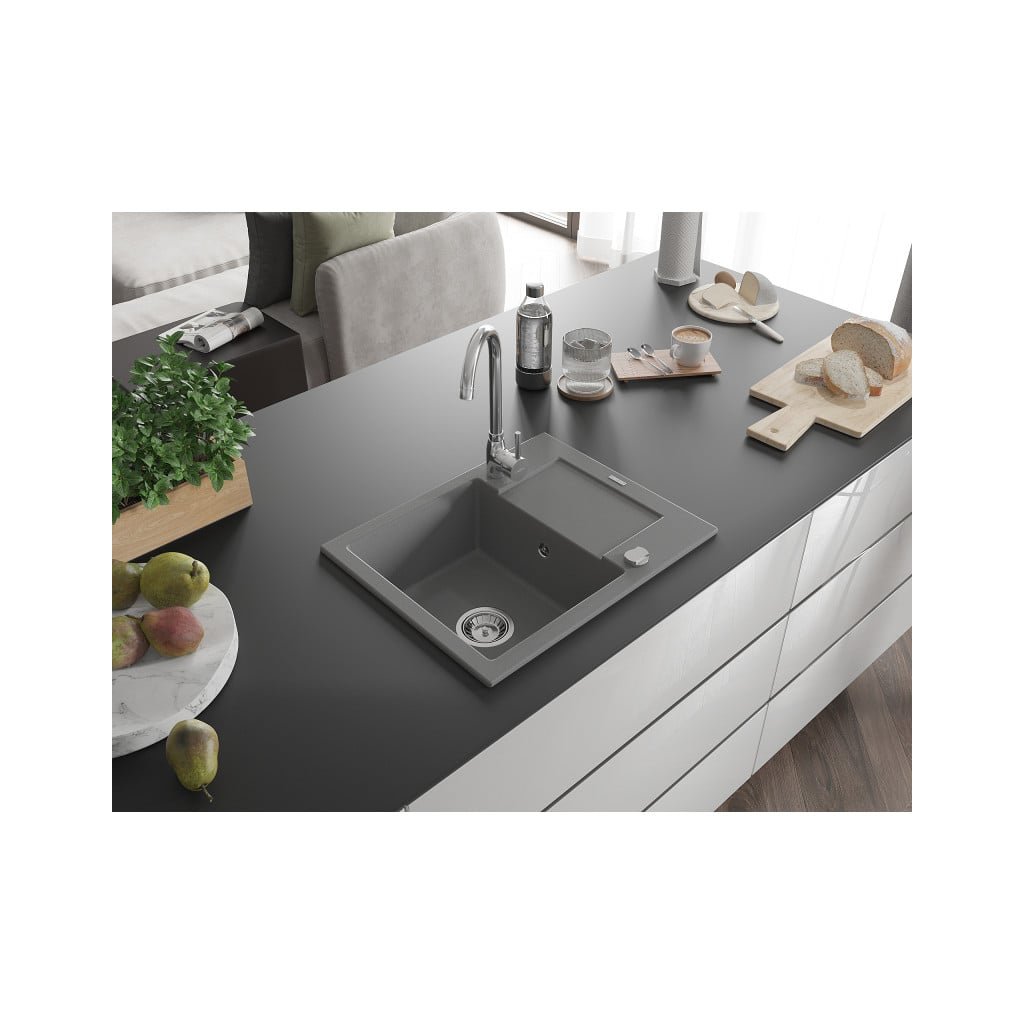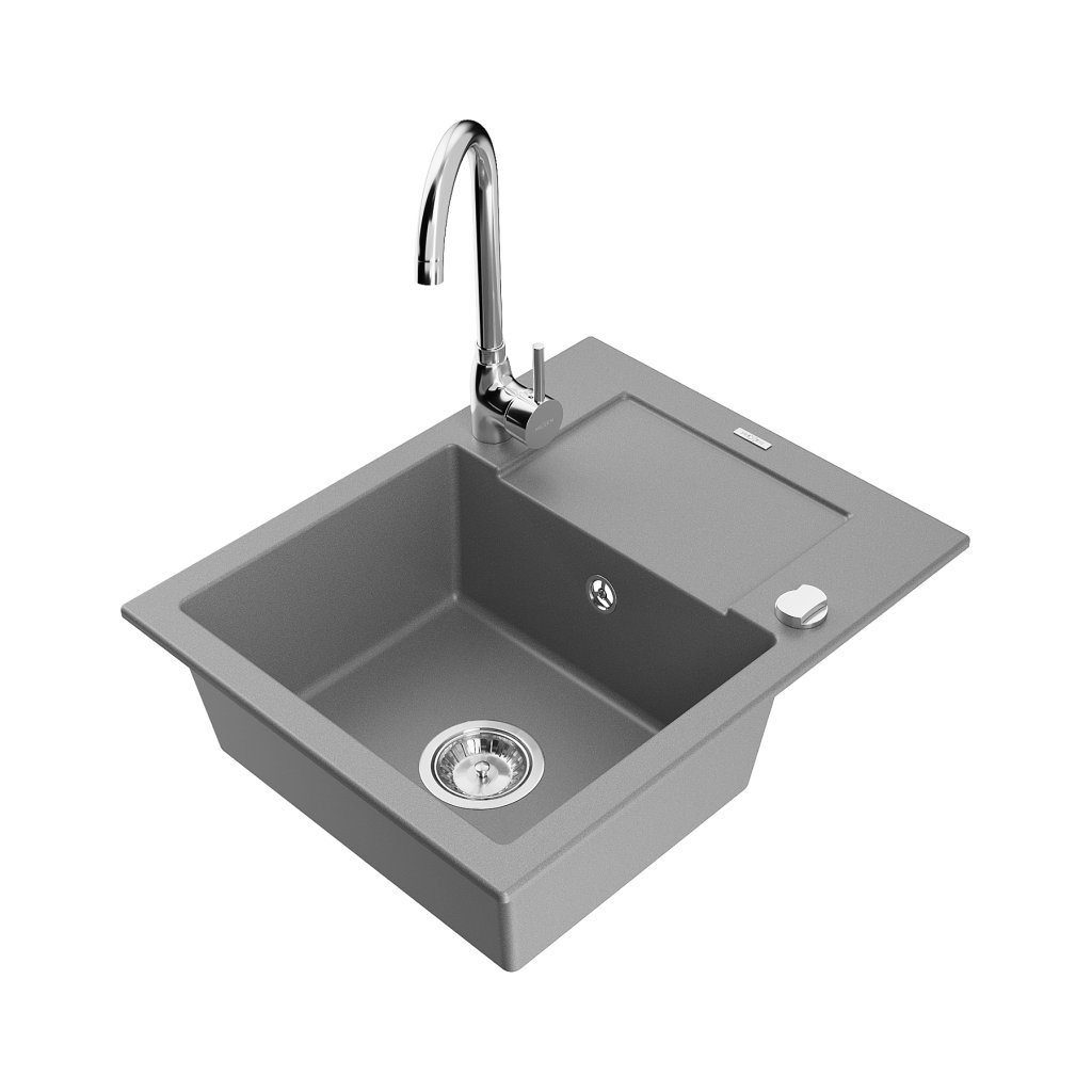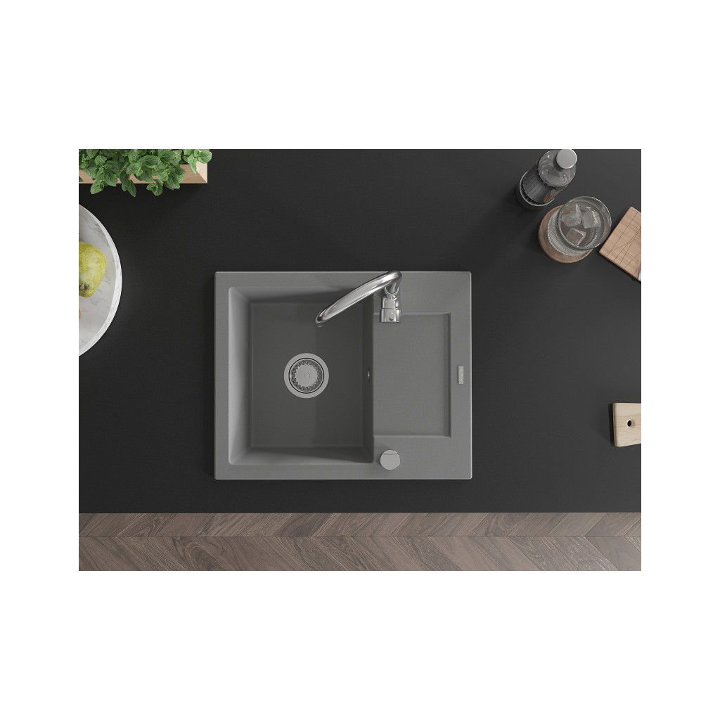 Mexen Enzo, 1-komorový granitový dřez s odkapávačem 58x47 cm a kuchyňskou baterií Telma, šedá, 6506-71-670200-00
