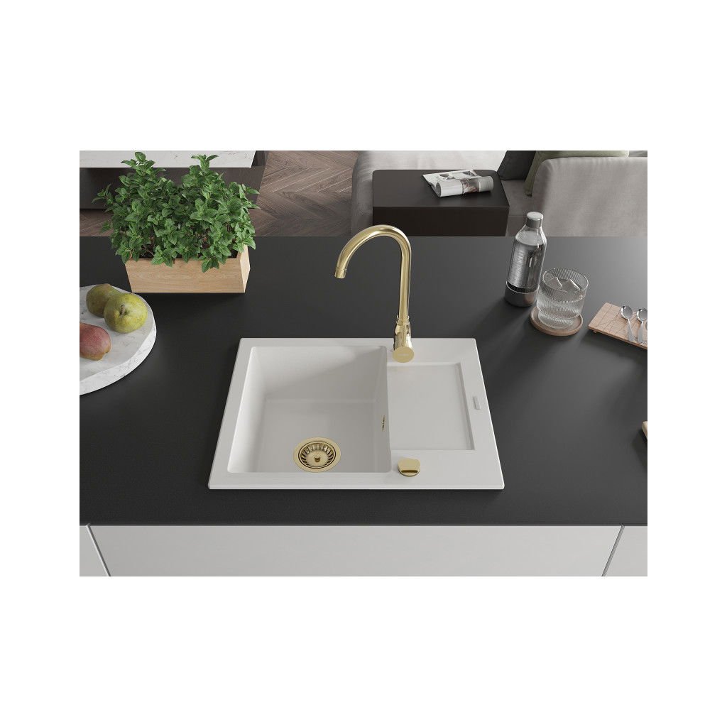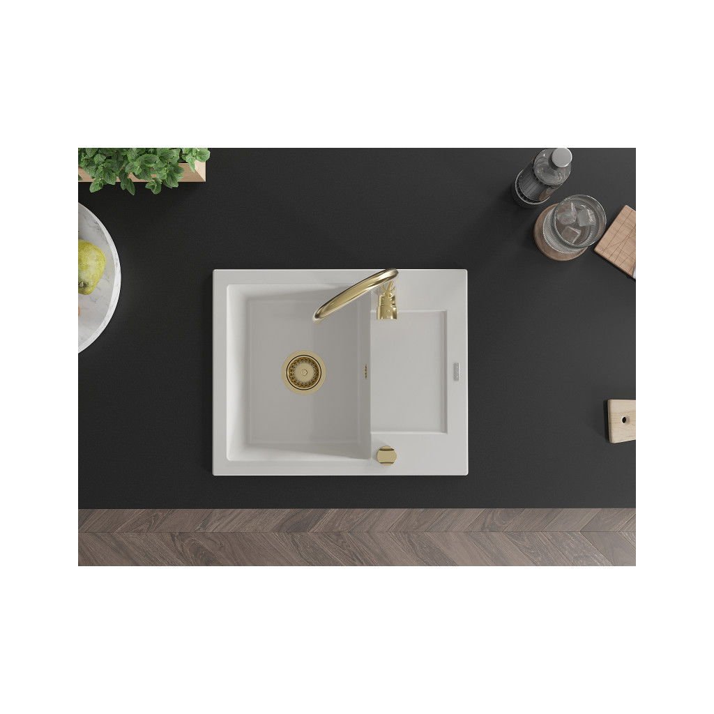 Mexen Enzo, granitový dřez 576x465x174 mm, 1-komorový, bílá se zlatým sifonem, 6506571005-20-G