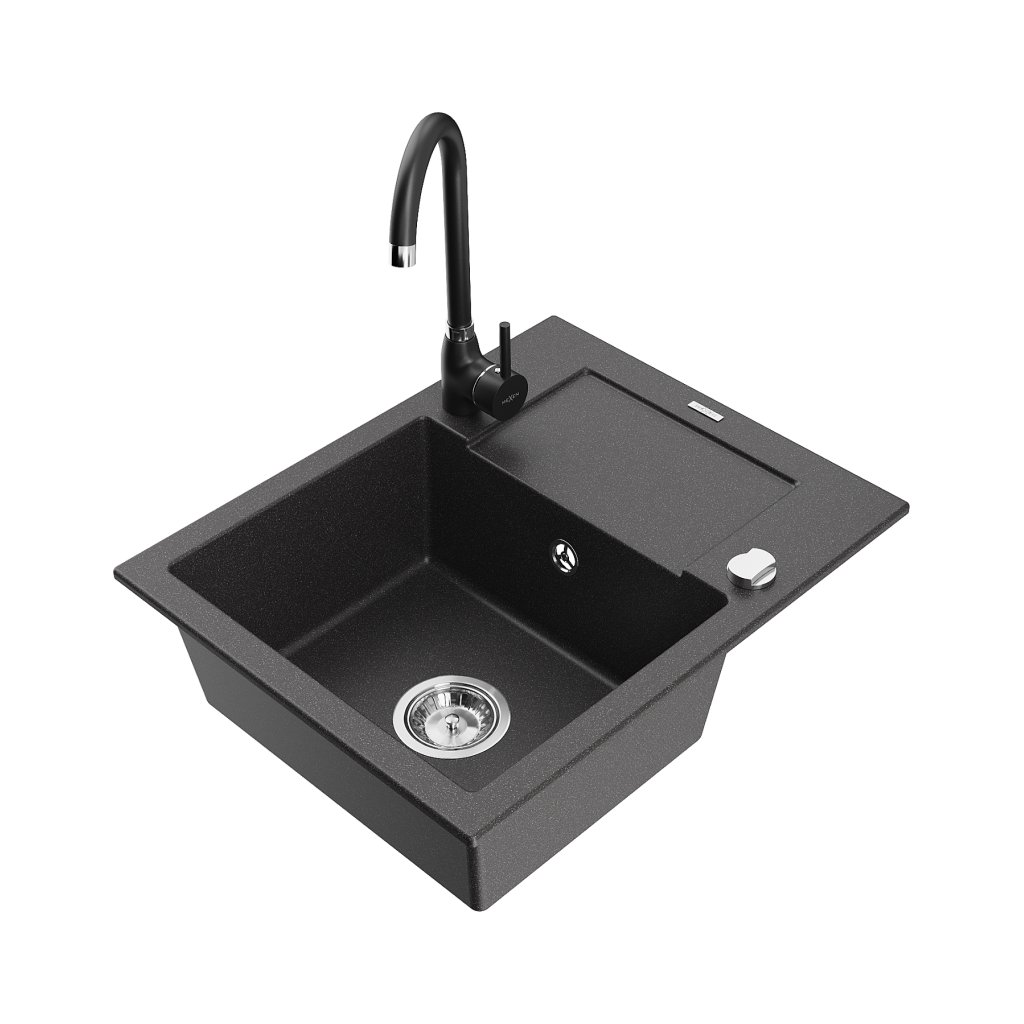 Mexen Enzo, granitový dřez 576x465x174 mm, 1-komorový, černá baterie Telma, černá skvrnitá, 6506-76-670200-70