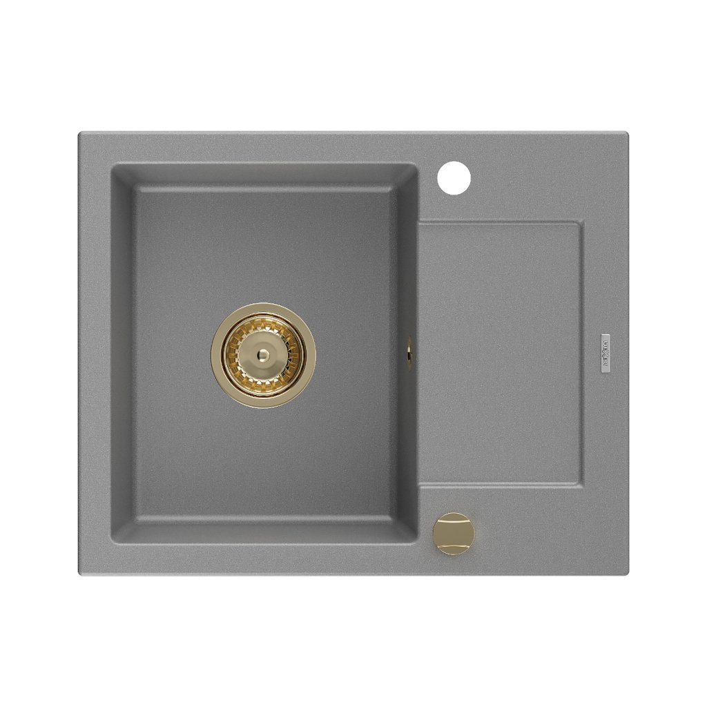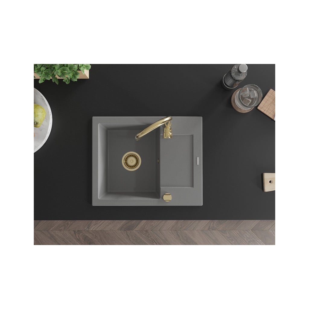Mexen Enzo, granitový dřez 576x465x174 mm, 1-komorový, šedá se zlatým sifonem, 6506571005-71-G