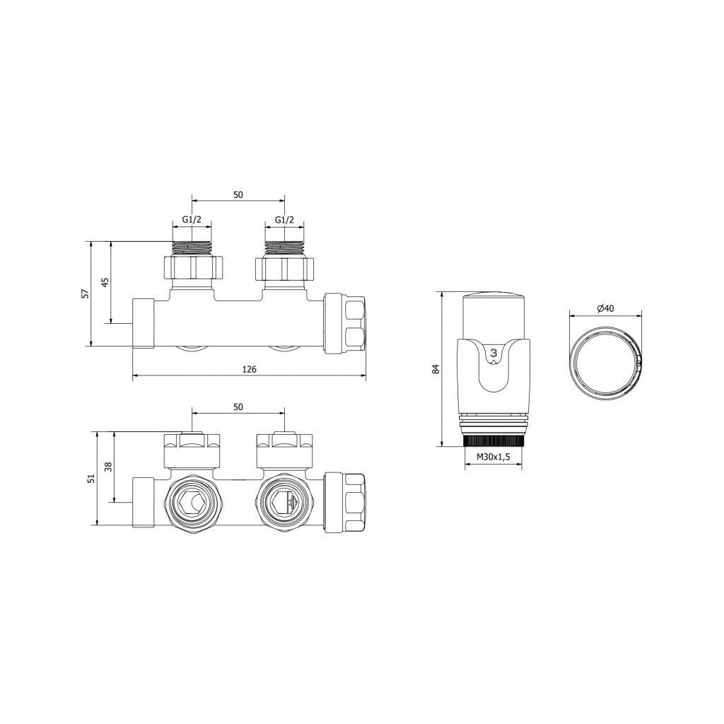 Mexen G00, připojovací sada ventilů termostatická pro středové připojení DN50, Duplex, chromová, W907-900-01