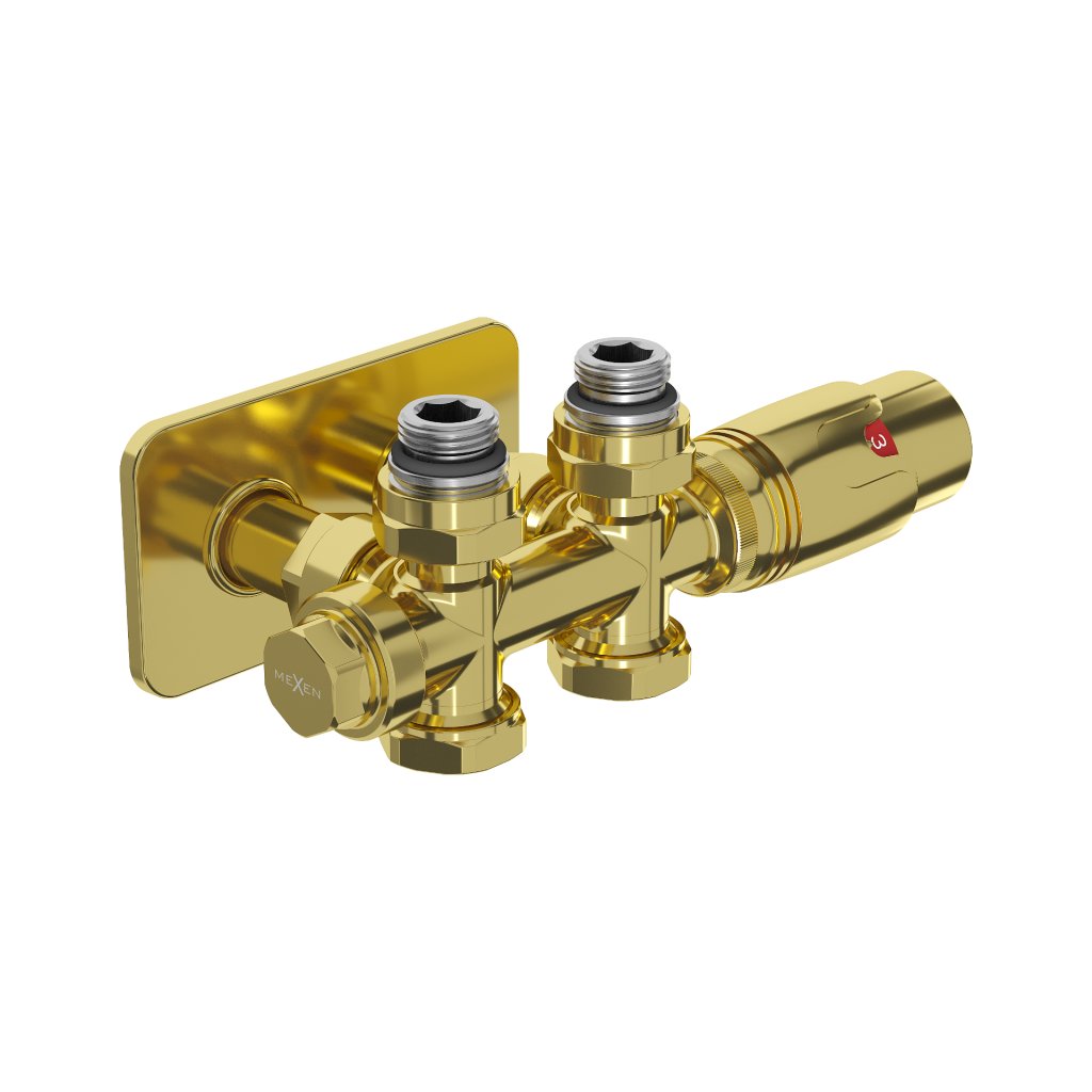 Mexen G00, termostatická souprava Duplex s hranatou krytkou, úhlové/rovné připojení DN50, zlatá lesklá, W908-900-910-50
