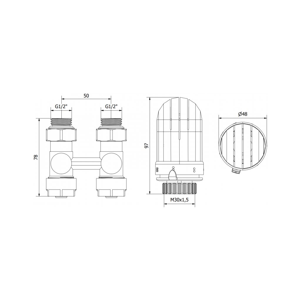 Mexen G03, termostatická sada DN50, úhlová 1/2"x16 mm a termostatická hlavice M30x1,5 mm, ocelová, W912-016-938-01