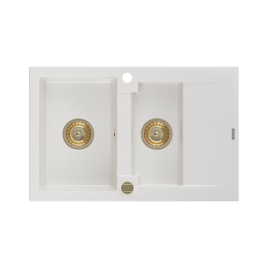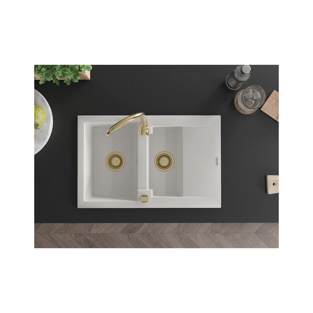 Mexen Gaspar, granitový dřez 737x475x177 mm, 1,5-komorový, bílá se zlatým sifonem, 6507731505-20-G