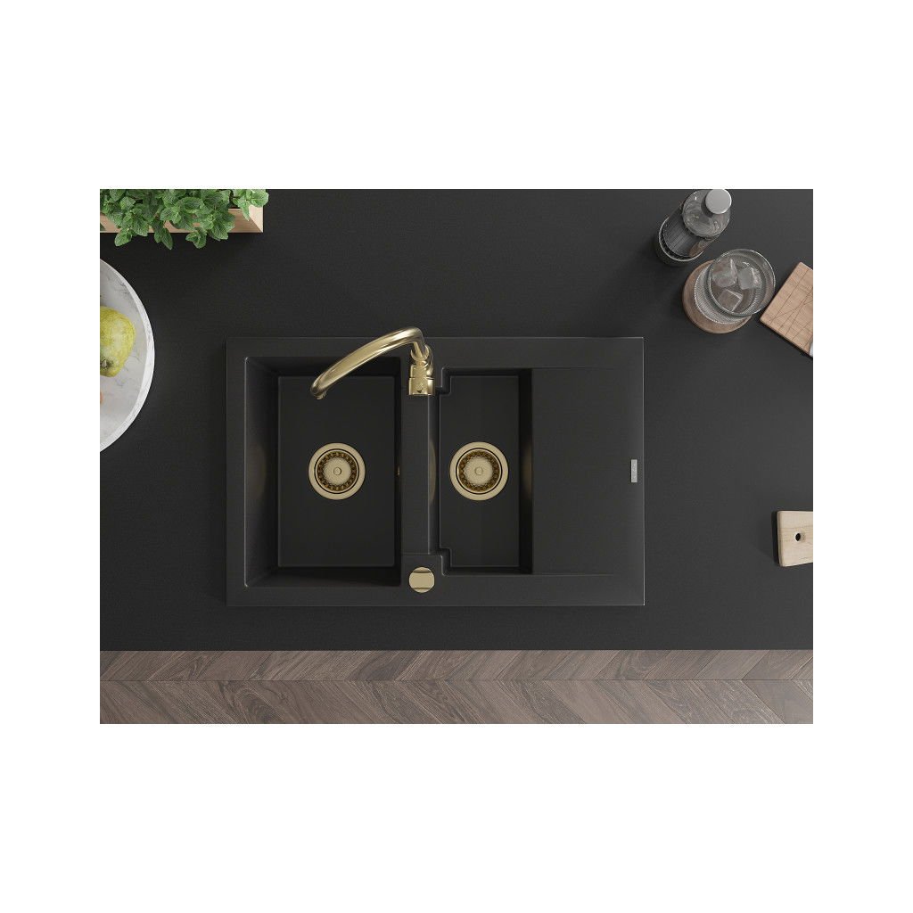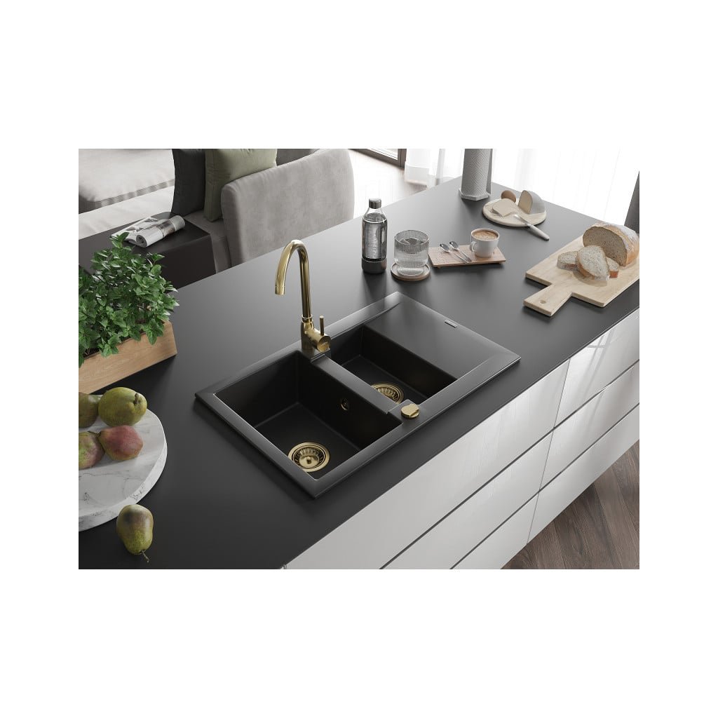 Mexen Gaspar, granitový dřez 737x475x177 mm, 1,5-komorový, černá se zlatým sifonem, 6507731505-77-G
