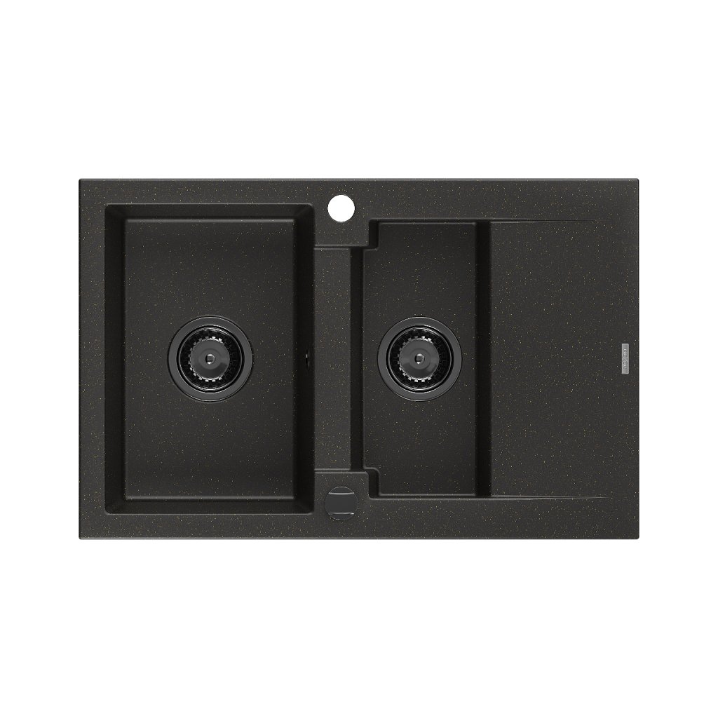 Mexen Gaspar, granitový dřez 737x475x177 mm, 1,5-komorový, černá-zlatá metalíza s černým sifonem, 6507731505-75-B