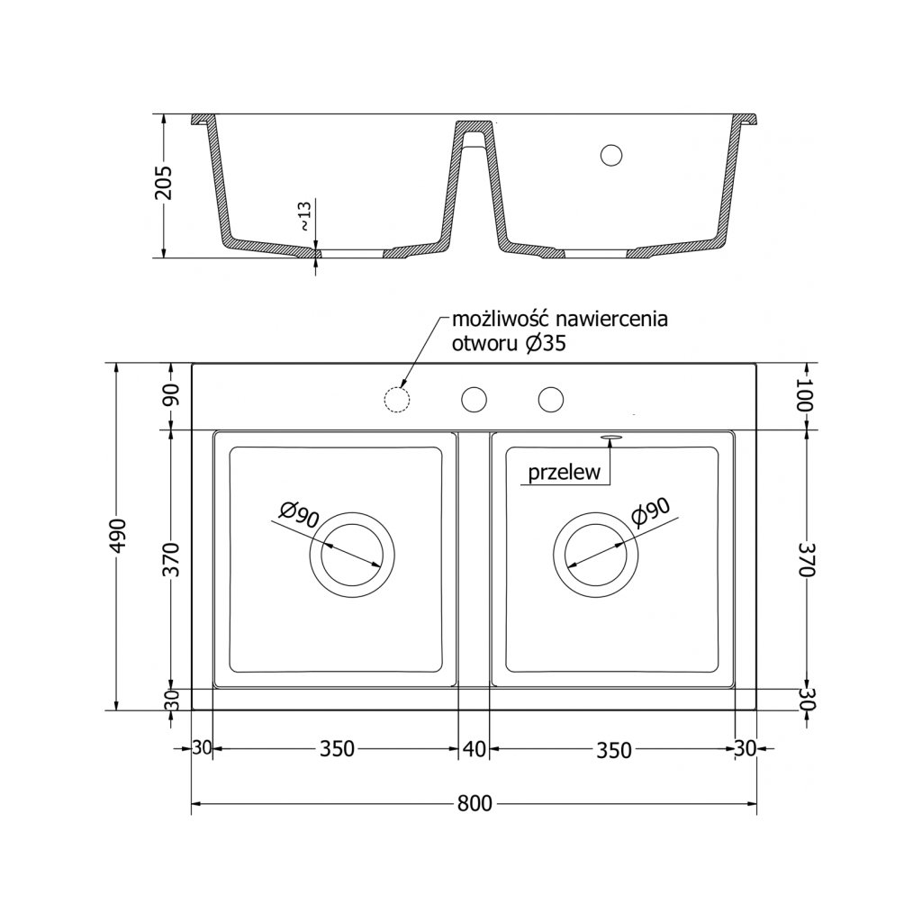 - Otvory: 2 (kuchyňská baterie, ovládání automatické odtokové zátky sifonu)