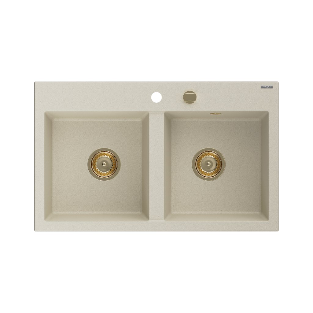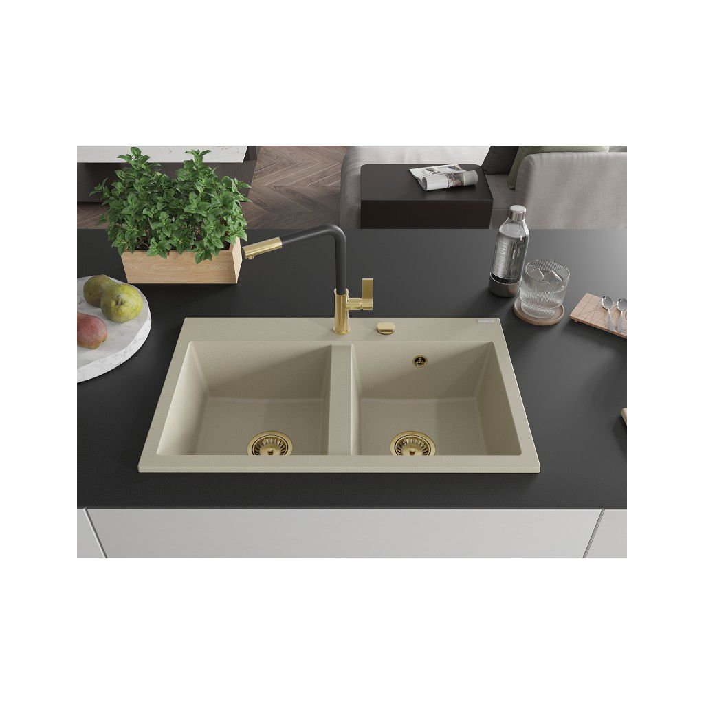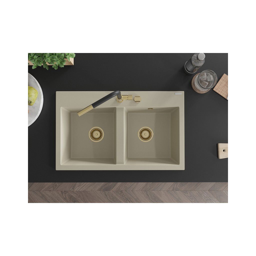 Mexen Hektor, 2-komorový granitový dřez 800x480x205 mm, béžová, zlatý sifon, 6521802000-69-G