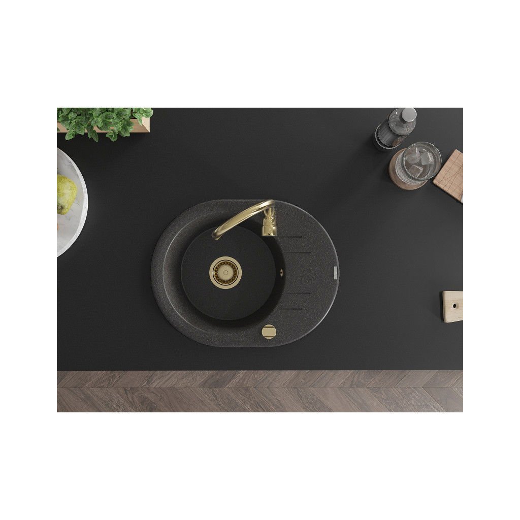 Mexen Kevin, granitový dřez 586x458x190 mm, 1-komorový, černá skvrnitá se zlatým sifonem, 6517581005-76-G