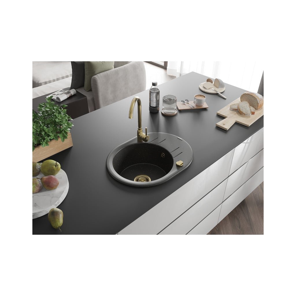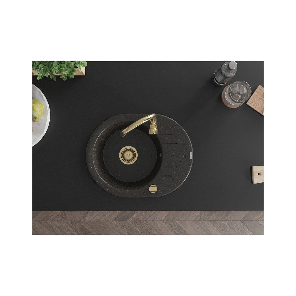 Mexen Kevin, granitový dřez 586x458x190 mm, 1-komorový, černá-zlatá metalíza se zlatým sifonem, 6517581005-75-G