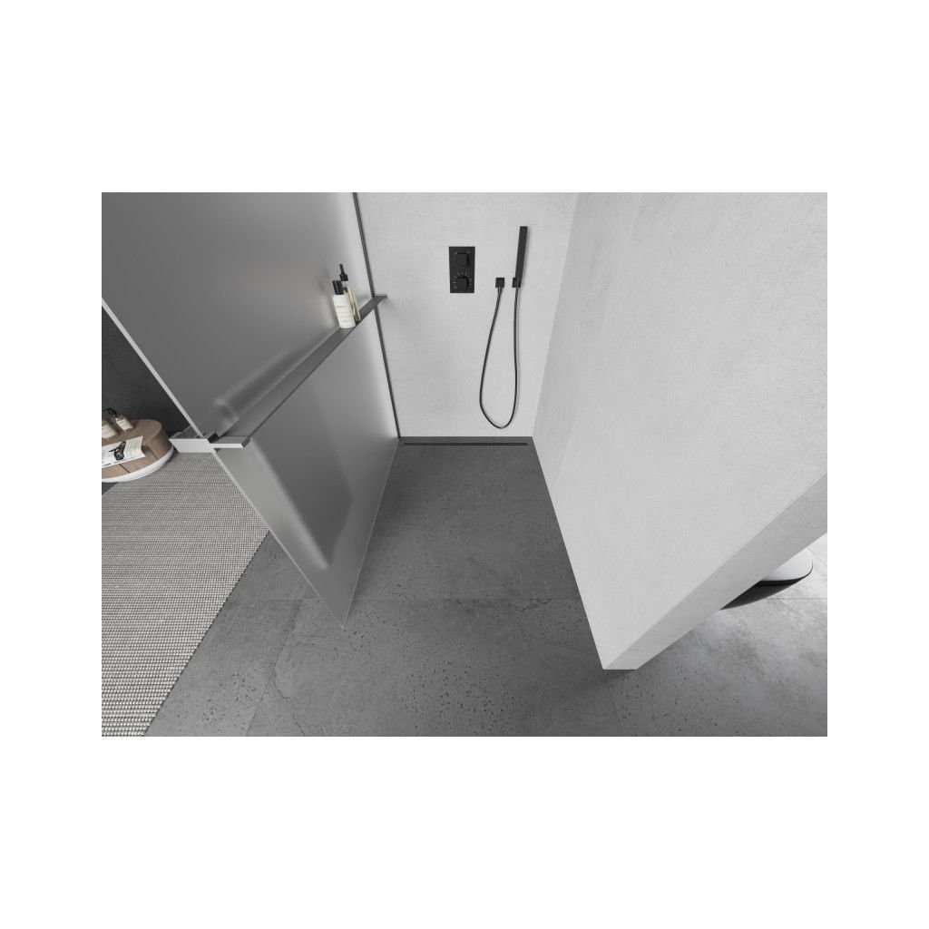 Mexen Kioto+ L, sprchová zástěna Walk-In s poličkou a ramínkem 100 x 200 cm, 8mm sklo námraza, grafitový profil, 800-100-123-95-30