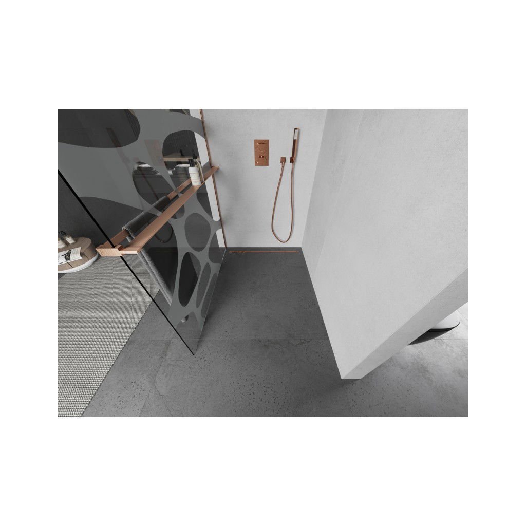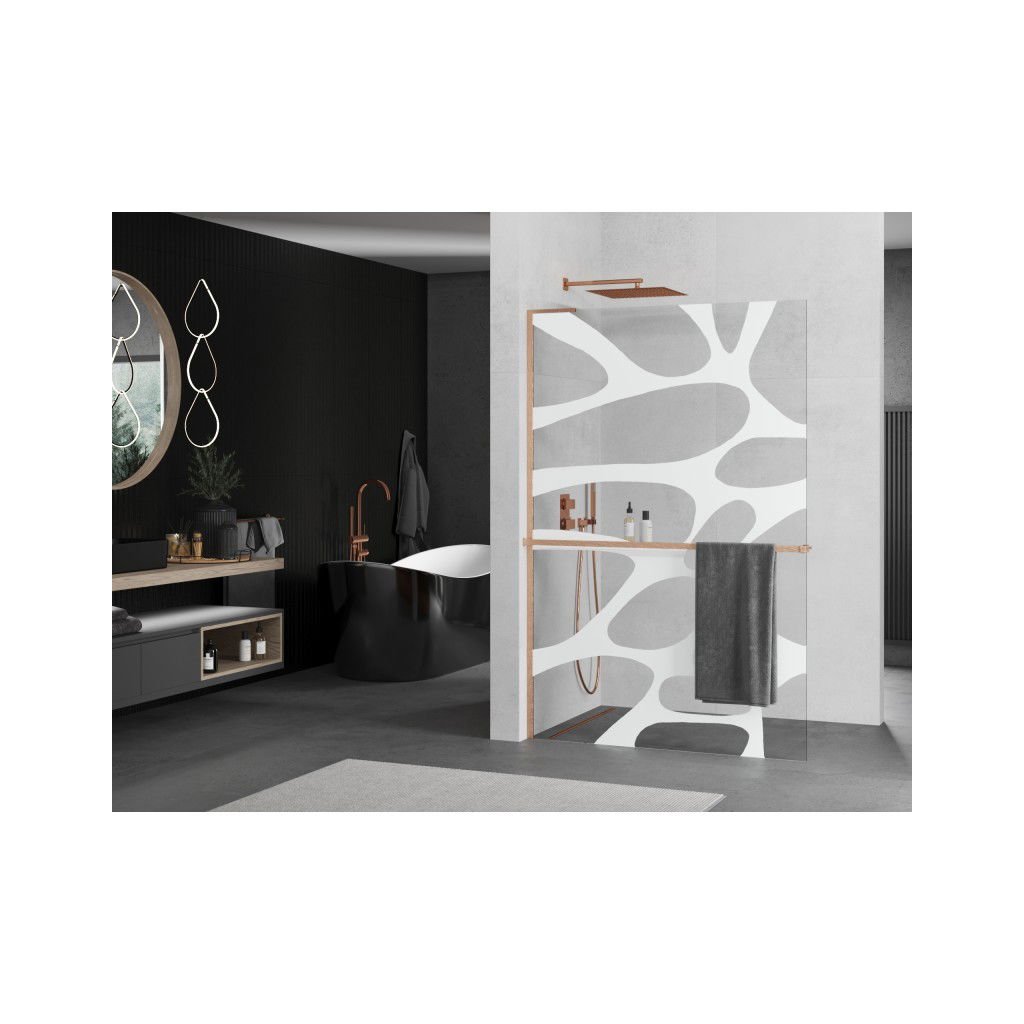 Mexen Kioto+ L, sprchová zástěna Walk-In s poličkou a věšákem 100 x 200 cm, 8mm čiré sklo bílý vzor, měděný matný profil, 800-100-123-65-97