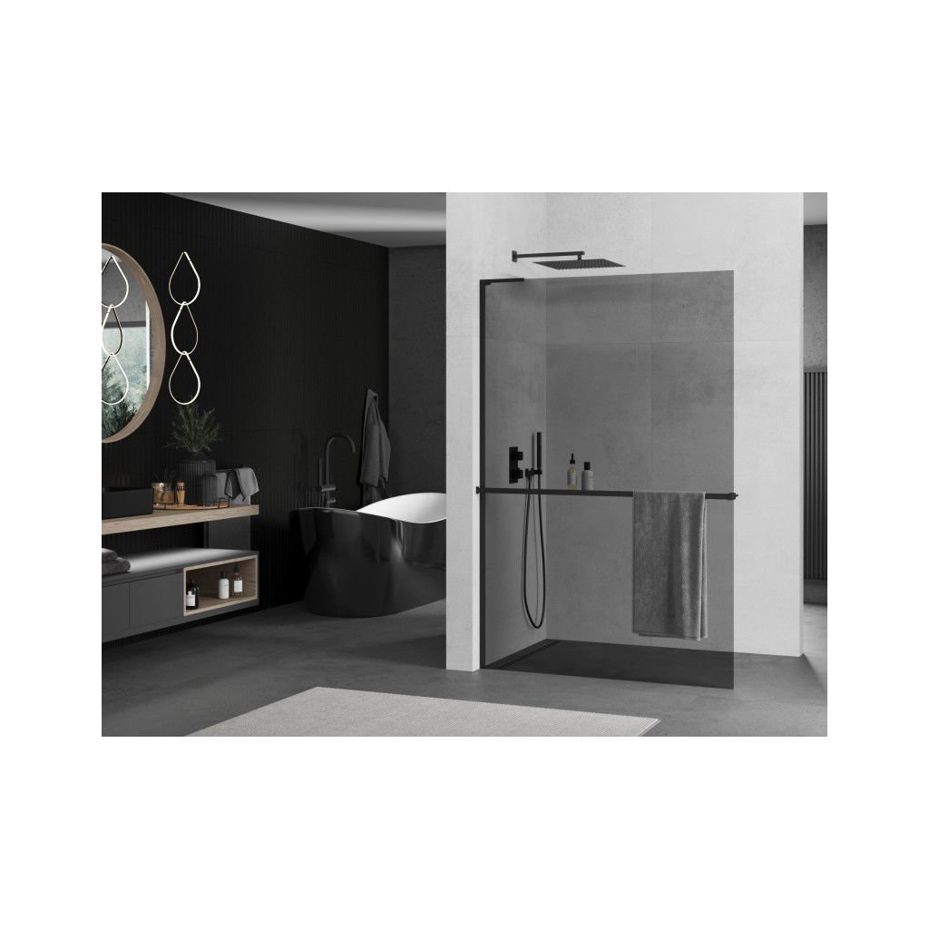 Mexen Kioto+ L, sprchová zástěna Walk-In s poličkou a věšákem 100 x 200 cm, 8mm šedé sklo, černý profil, 800-100-123-70-40