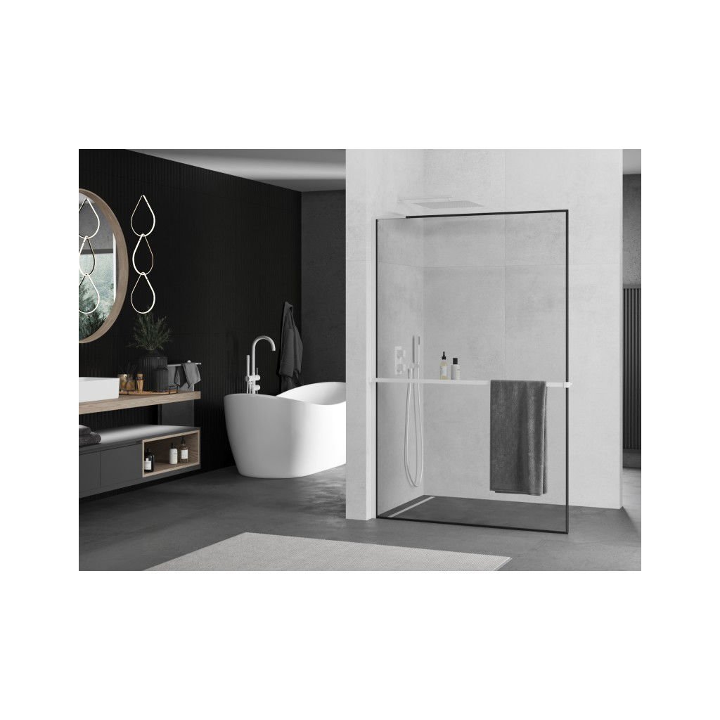 Mexen Kioto+ L, sprchová zástěna Walk-In s poličkou a věšákem 110 x 200 cm, 8mm čiré sklo černý vzor, bílý profil, 800-110-123-20-70