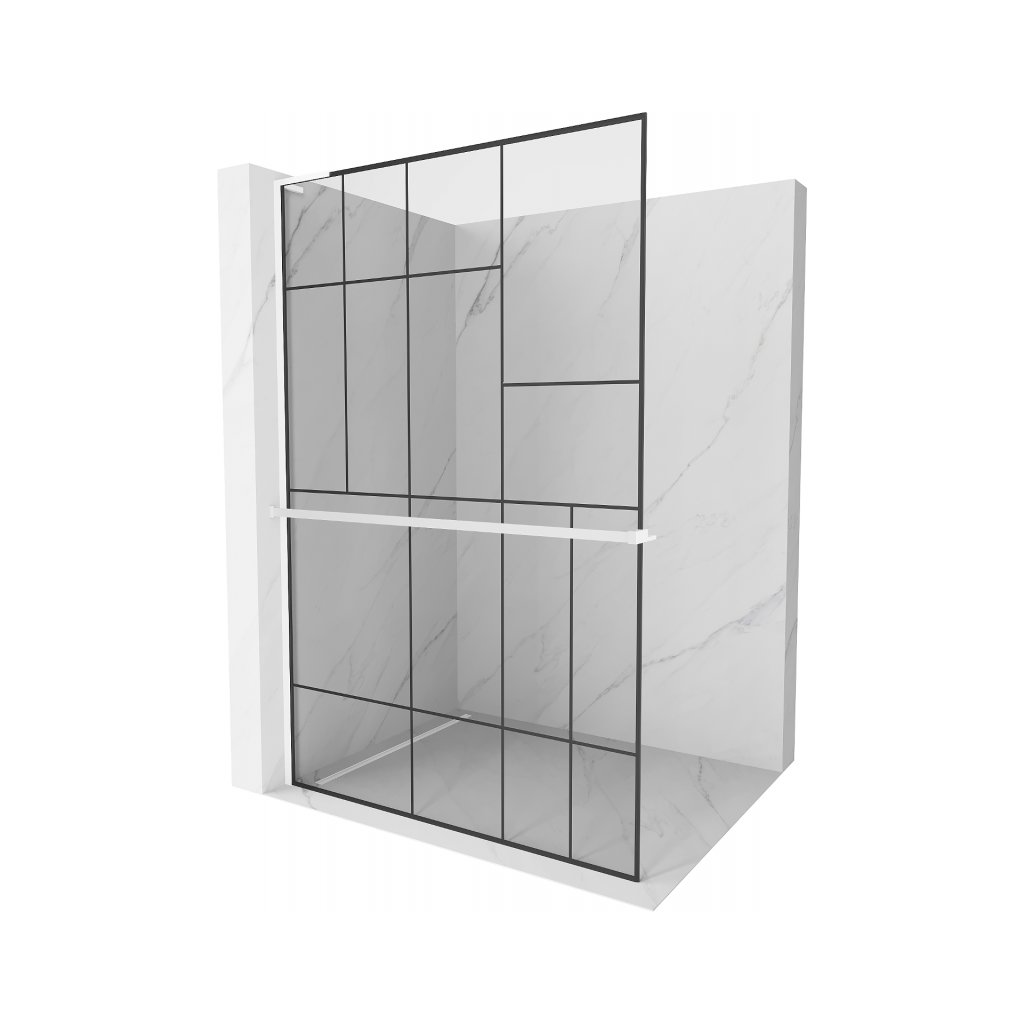 Mexen Kioto+ L, sprchová zástěna Walk-In s poličkou a věšákem 120 x 200 cm, 8mm čiré sklo černý vzor, bílý profil, 800-120-123-20-78