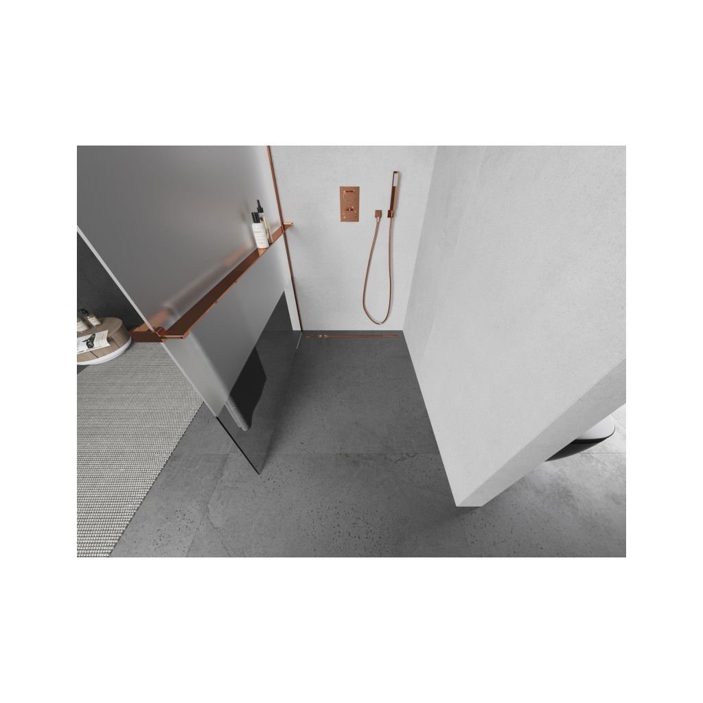 Mexen Kioto+ L, sprchová zástěna Walk-In s poličkou a věšákem 120 x 200 cm, 8mm čiré sklo-námraza, růžové zlato profil, 800-120-123-60-35