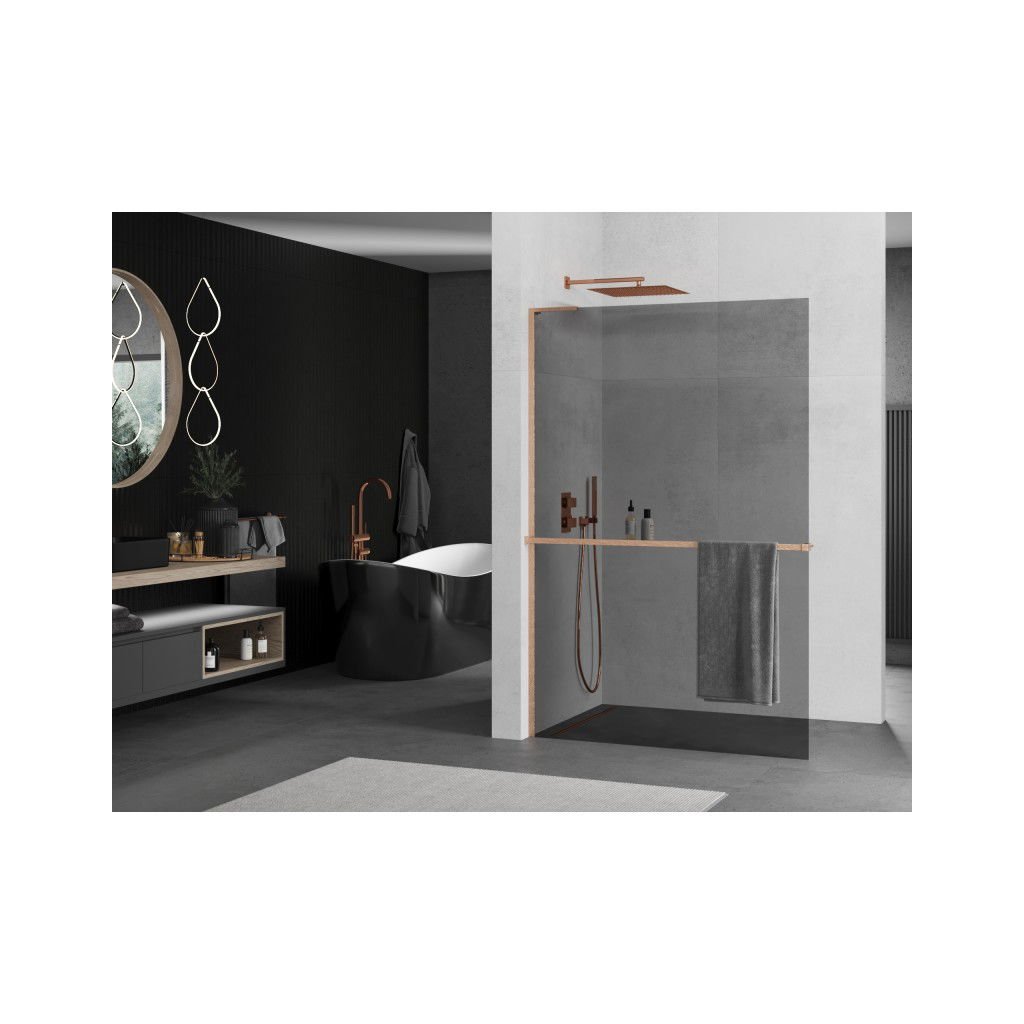Mexen Kioto+ L, sprchová zástěna Walk-In s poličkou a věšákem 120 x 200 cm, 8mm šedé sklo, měděný matný profil, 800-120-123-65-40