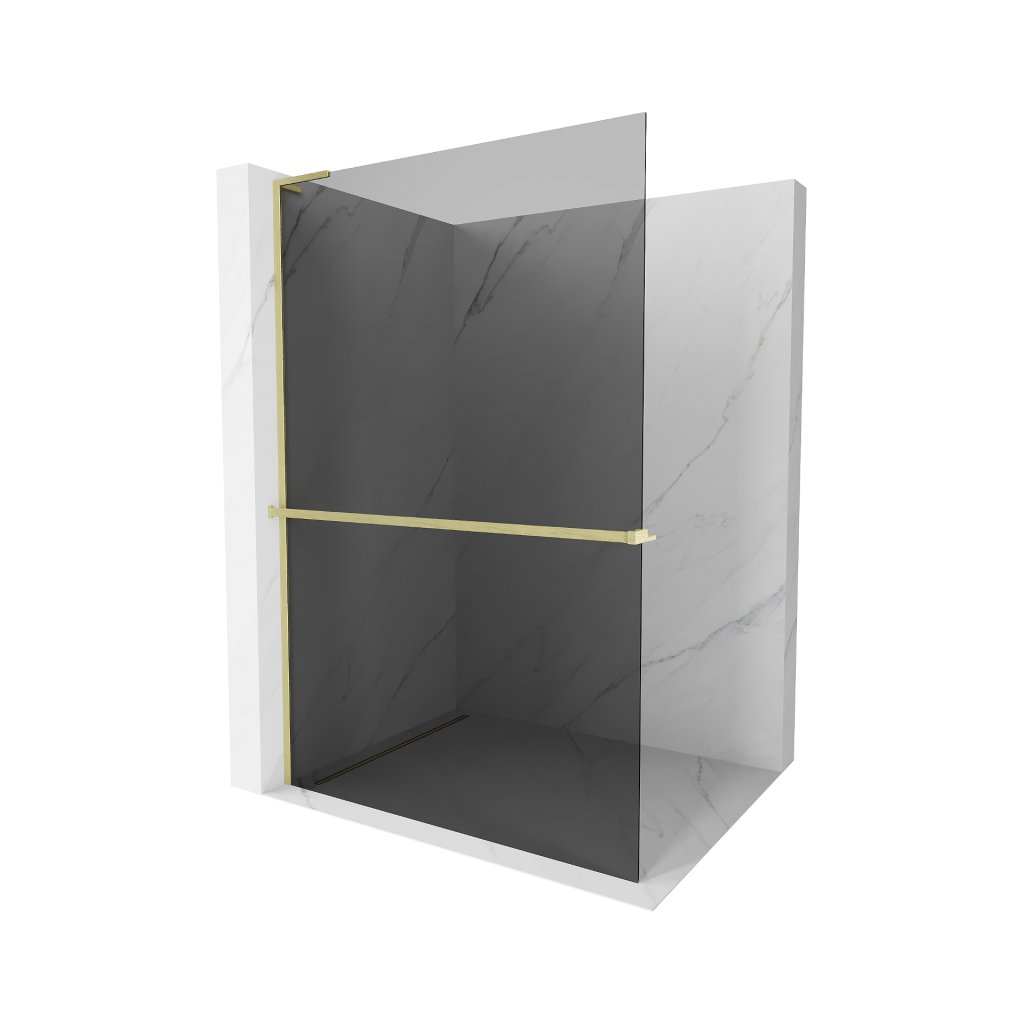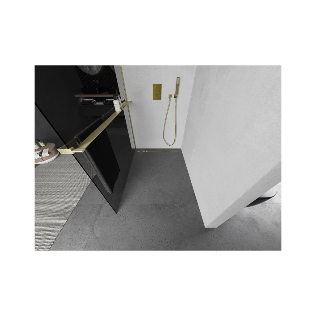 Mexen Kioto+ L, sprchová zástěna Walk-In s poličkou a věšákem 120 x 200 cm, 8mm šedé sklo, zlatý matný profil, 800-120-123-55-40