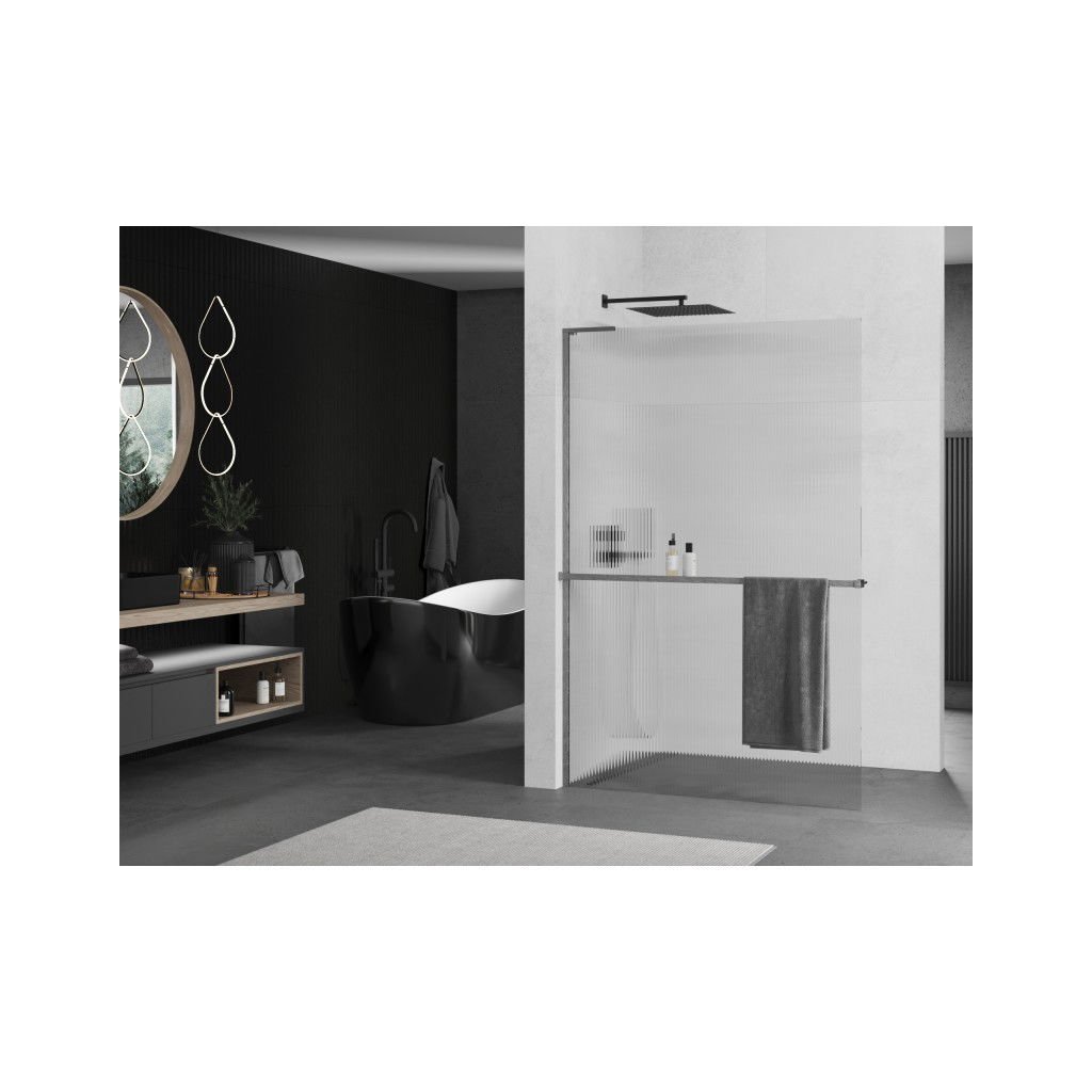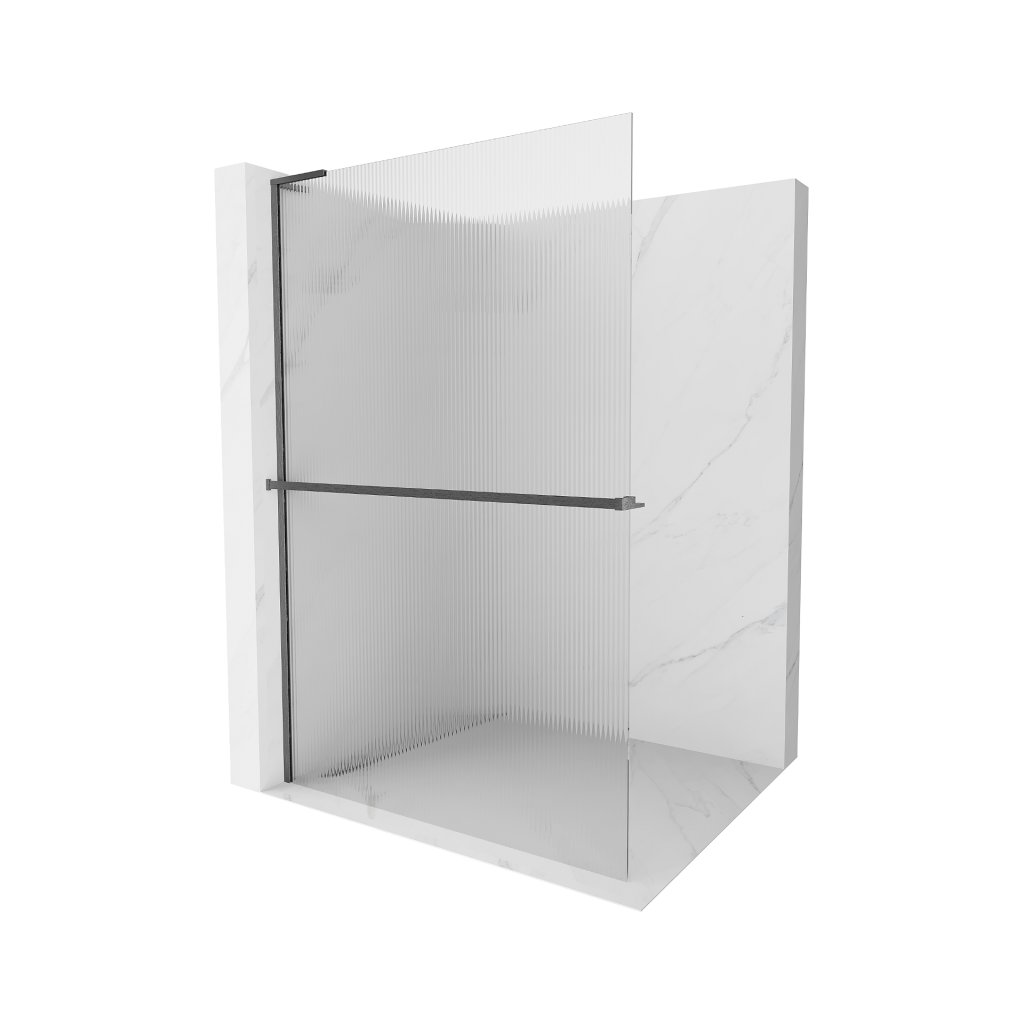 Mexen Kioto+ L, sprchová zástěna Walk-In s poličkou a věšákem 120 x 200 cm, 8mm sklo s žebrovým vzorem, grafitový profil, 800-120-123-66-09