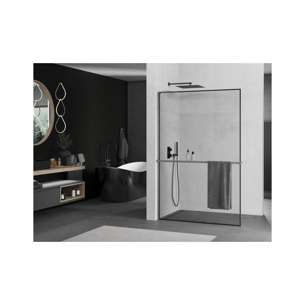 Mexen Kioto+ L, sprchová zástěna Walk-In s poličkou a věšákem 50 x 200 cm, 8mm čiré sklo černý vzor, grafitový profil, 800-050-123-66-70
