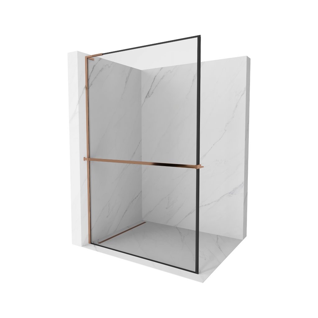 Mexen Kioto+ L, sprchová zástěna Walk-In s poličkou a věšákem 60 x 200 cm, 8mm čiré sklo černý vzor, růžové zlato profil, 800-060-123-60-70