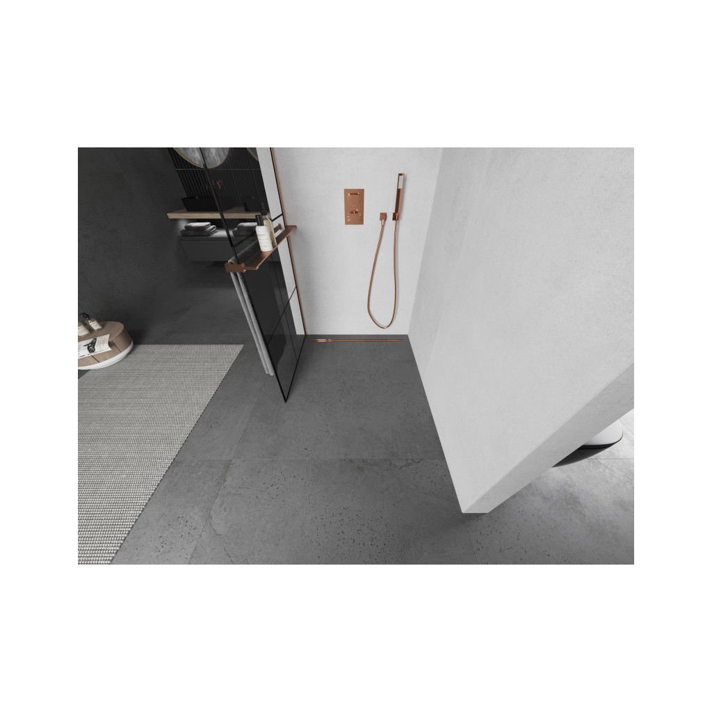 Mexen Kioto+ L, sprchová zástěna Walk-In s poličkou a věšákem 70 x 200 cm, 8mm čiré sklo černý vzor, měděný matný profil, 800-070-123-65-77