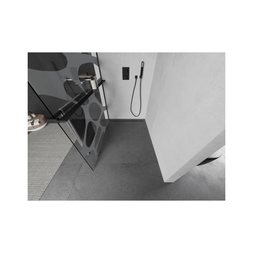 Mexen Kioto+ L, sprchová zástěna Walk-In s poličkou a věšákem 80 x 200 cm, 8mm čiré sklo bílý vzor, černý profil, 800-080-123-70-97
